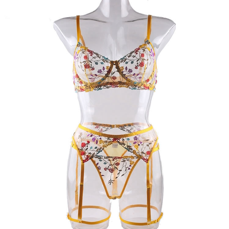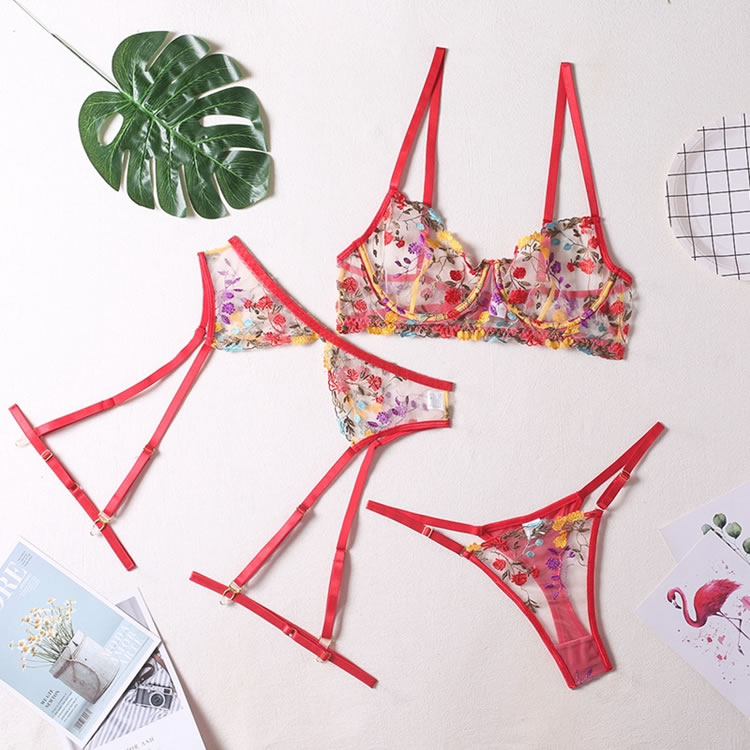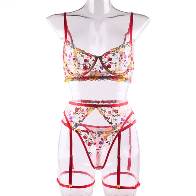 Embroidered Underwired Mesh 3 Piece Lingerie Set