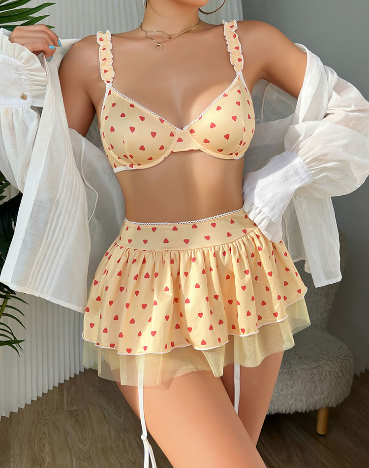 Ignite the night in this alluring bra set, featuring underwire cups, adjustable spaghetti straps, and a hook-and-eye back closure. Complete with a matching mini skirt, adjustable garter straps, and a thong panty, this set is perfect for creating a sensual and captivating look. (Thigh-high stockings not included.)