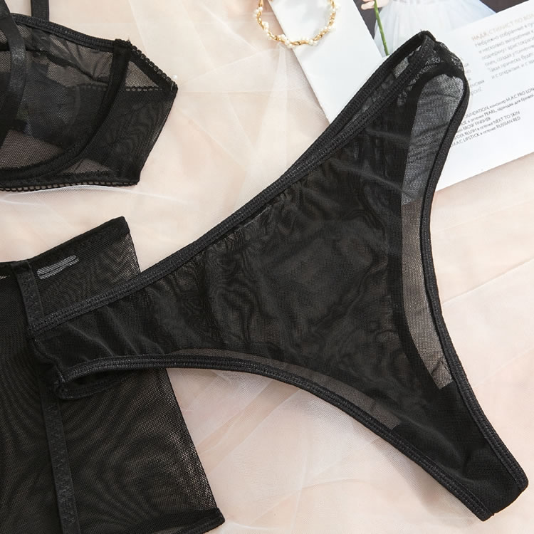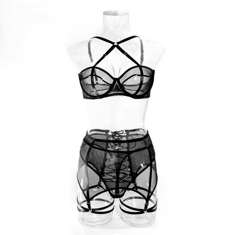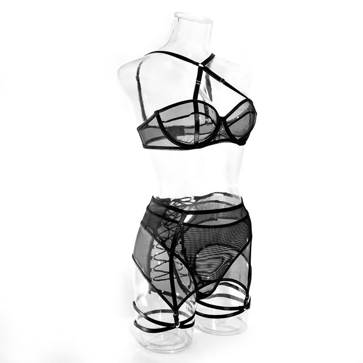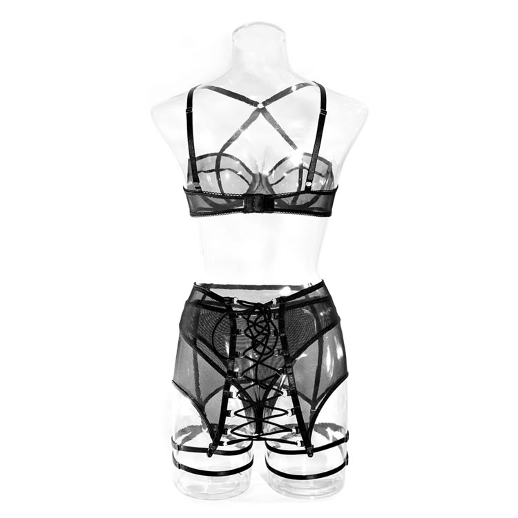 Accentuate your curvaceous figure in this ultra sexy exclusive bra set featuring sheer mesh underwire cups, a high choker neck, O-ring accents, adjustable spaghetti straps, a hook and eye back closure, and a matching skirt with criss-cross accents, wraparound leg garters, and a matching high waisted panty with a cheeky cut back.