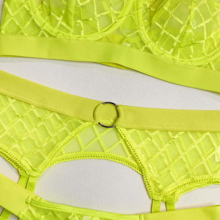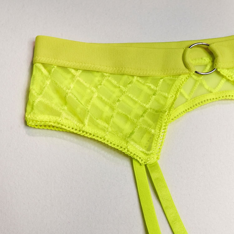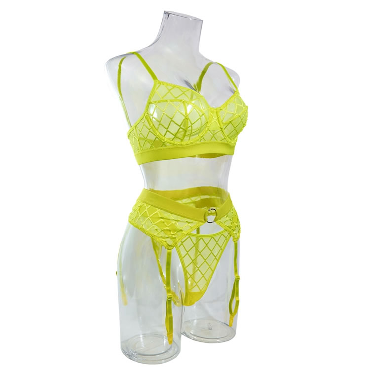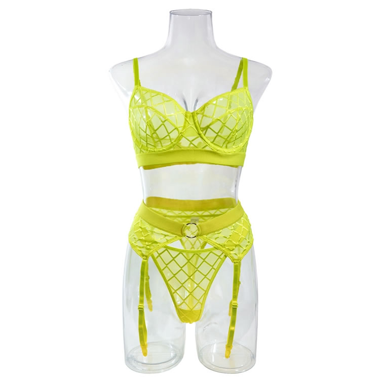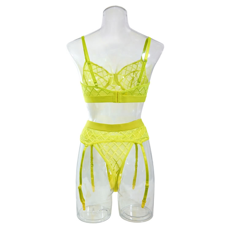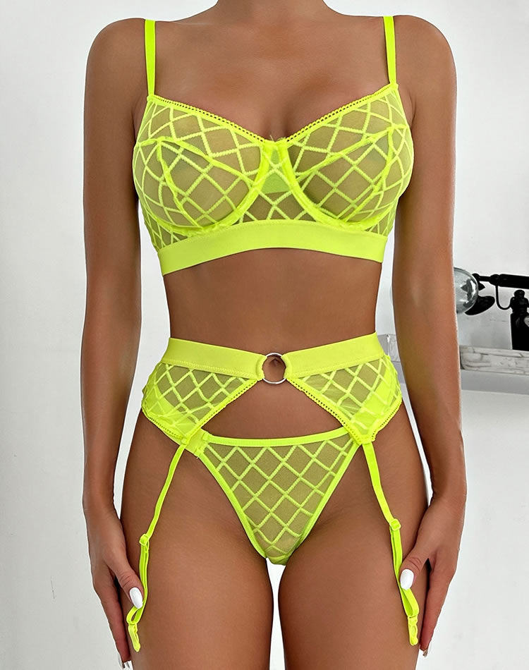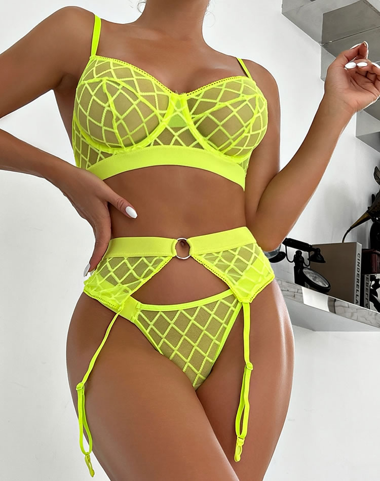 3-piece sheer mesh lingerie set features sheer mesh underwire cups, adjustable spaghetti straps, a hook and eye back closure, a matching high waisted garter belt with adjustable garter straps, and a matching panty.