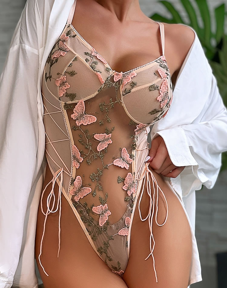 You'll be feeling oh so sweet in this stunning exclusive lace teddy featuring sheer mesh cups with appliques, adjustable spaghetti straps, a sheer mesh bodice with delicate appliques, ultra high cut sides, a snap crotch, and a cheeky cut back.