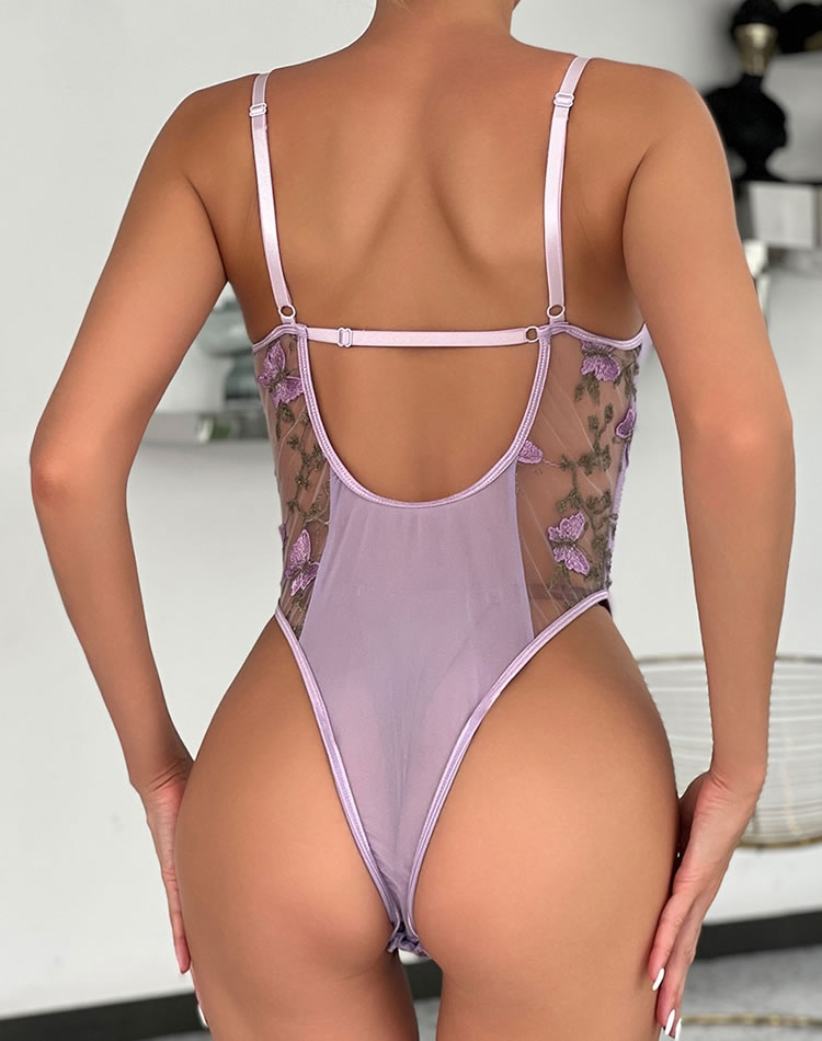 Tempt and tease in this exclusive teddy featuring sheer mesh cups with appliques, adjustable spaghetti straps, a sheer mesh bodice with delicate appliques, ultra high cut sides, a snap crotch, and a cheeky cut back.
