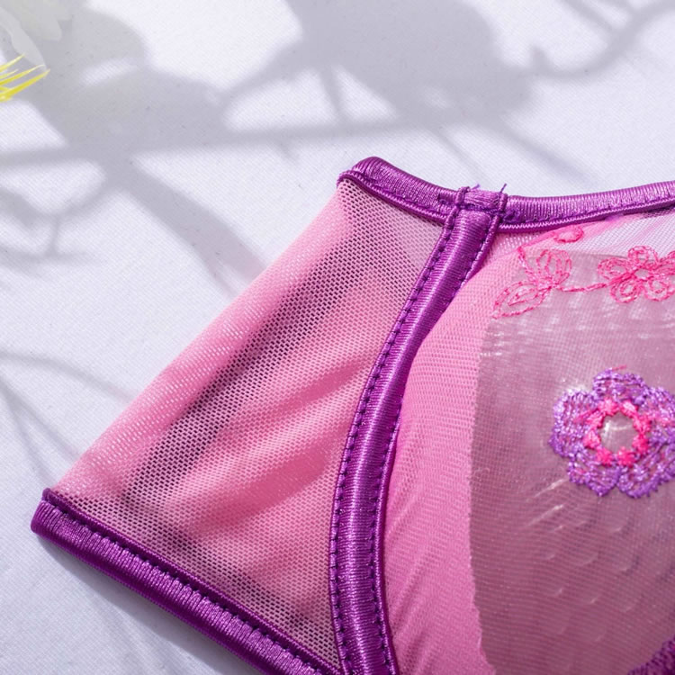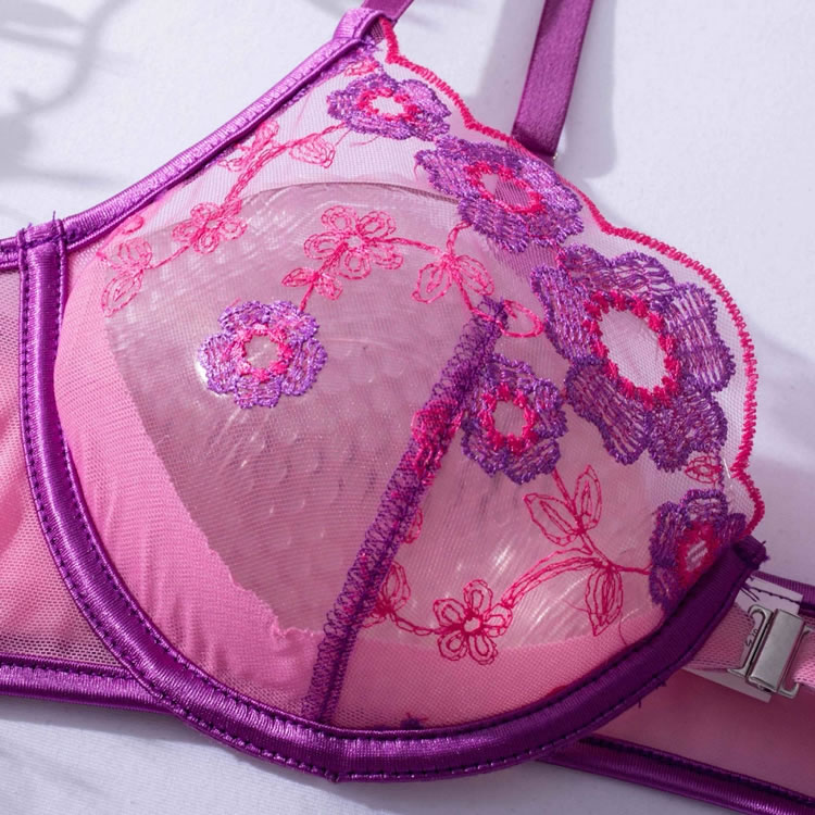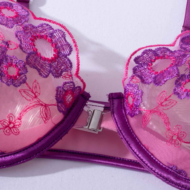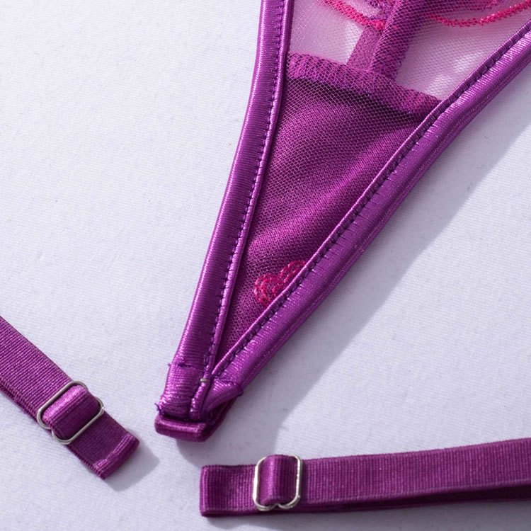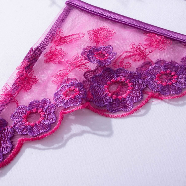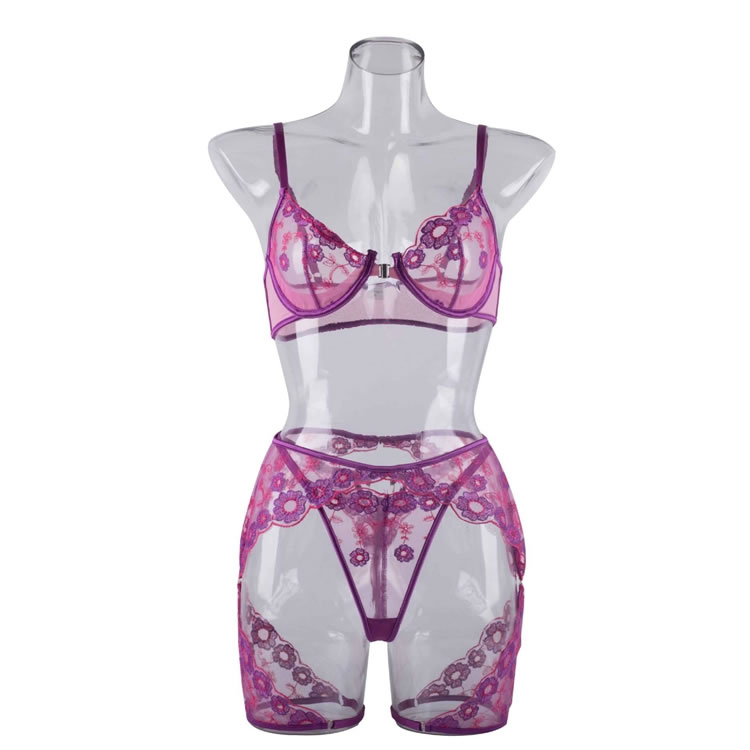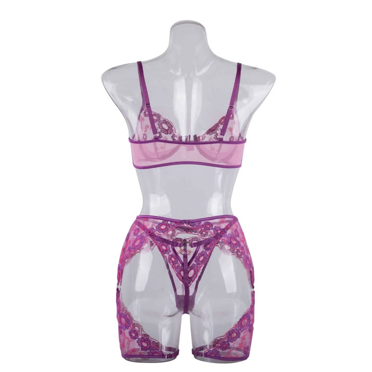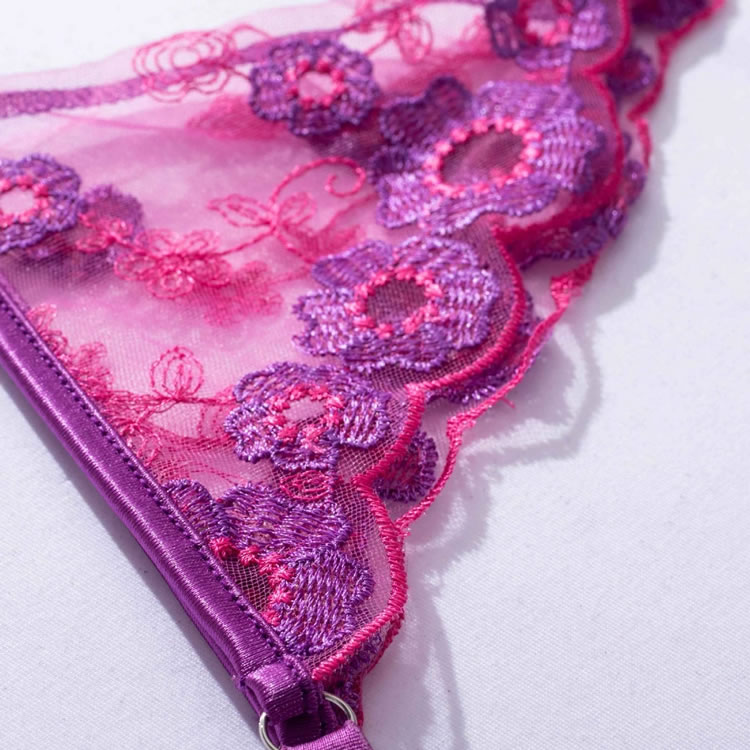 Brighten up your boudoir with this exclusive lace bra set featuring sheer lace underwire cups, adjustable spaghetti straps, a front hook closure, a matching high waisted garter belt with wraparound leg garters, and a matching panty with a strappy waistband and a thong cut back.