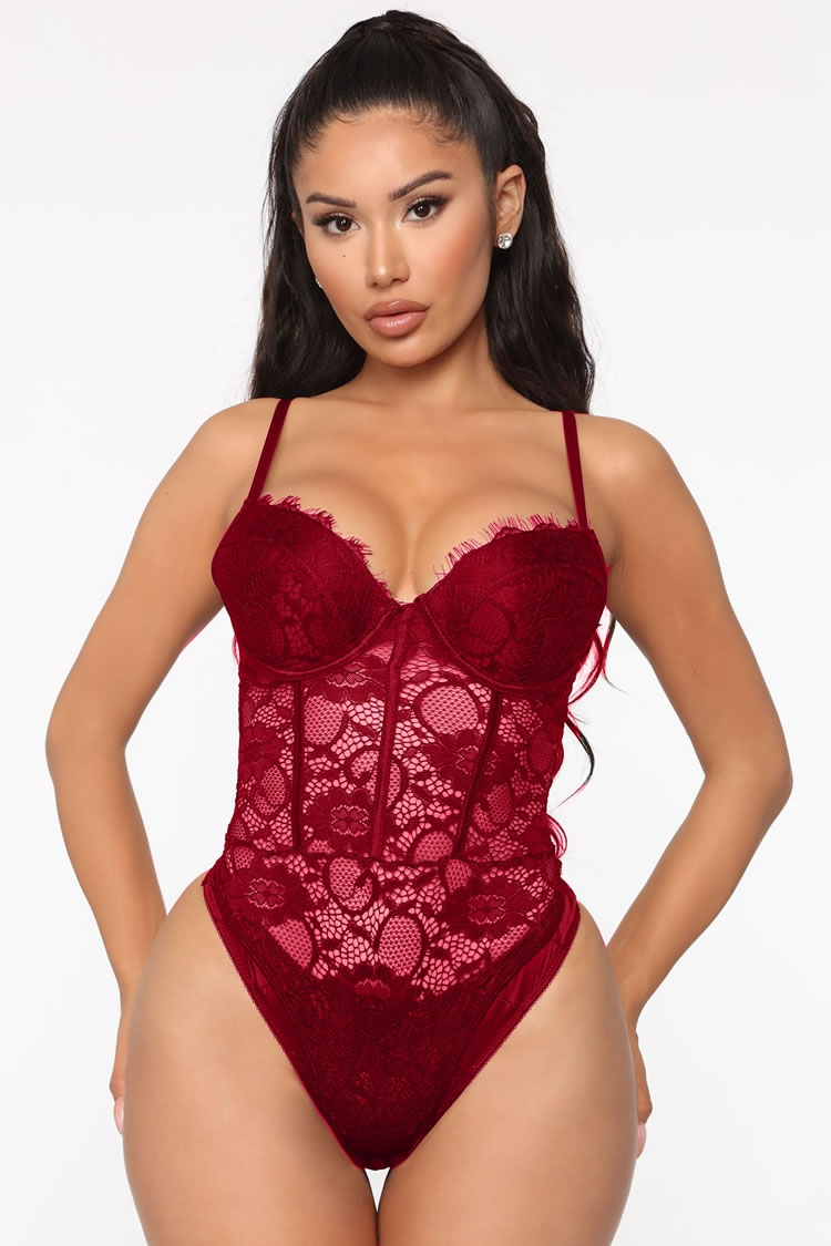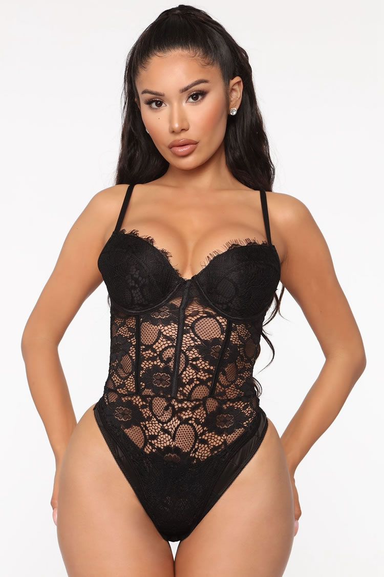 Show your sassy love in this flirty teddy featuring a V-neckline, soft lace cups, adjustable spaghetti straps, a sheer lace bodice, high cut sides, and a cheeky cut back.
