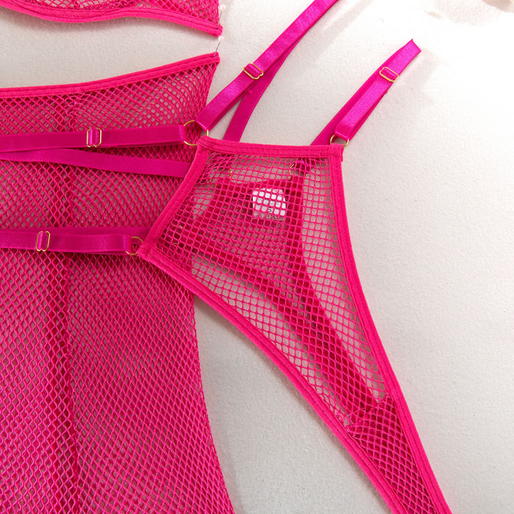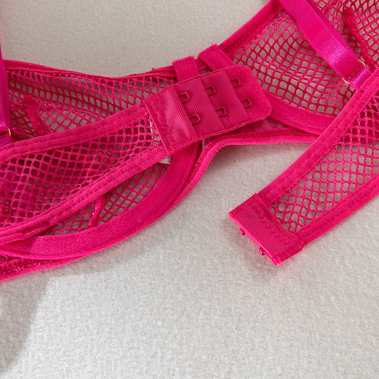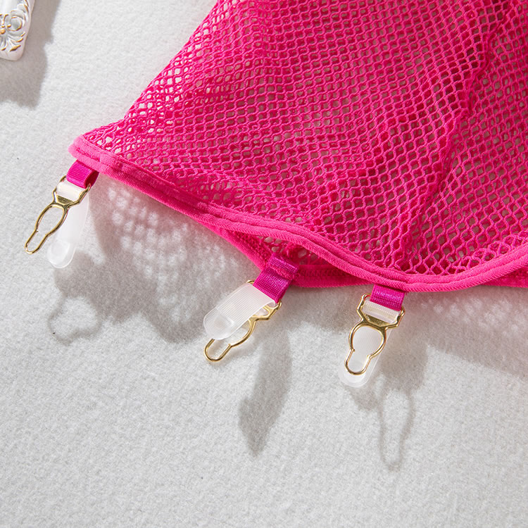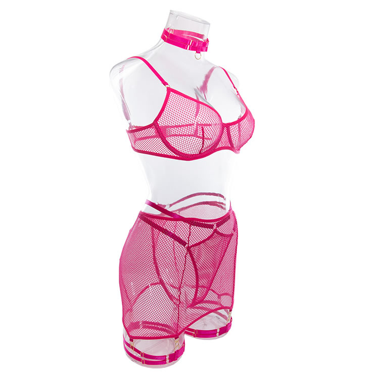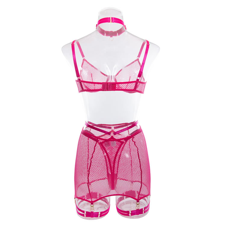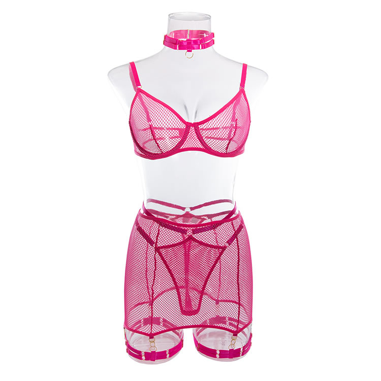Test your limits in this stunning bra set featuring sheer mesh underwire cups, adjustable shoulder straps, a hook and eye back closure, a matching garter skirt with garter straps, wraparound leg garters, a choker, and a matching panty with a thong cut back.