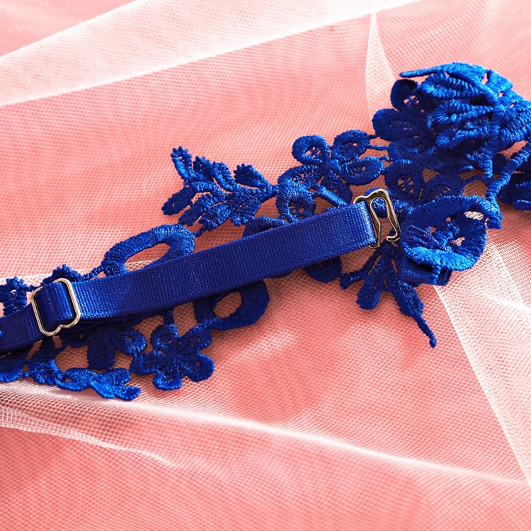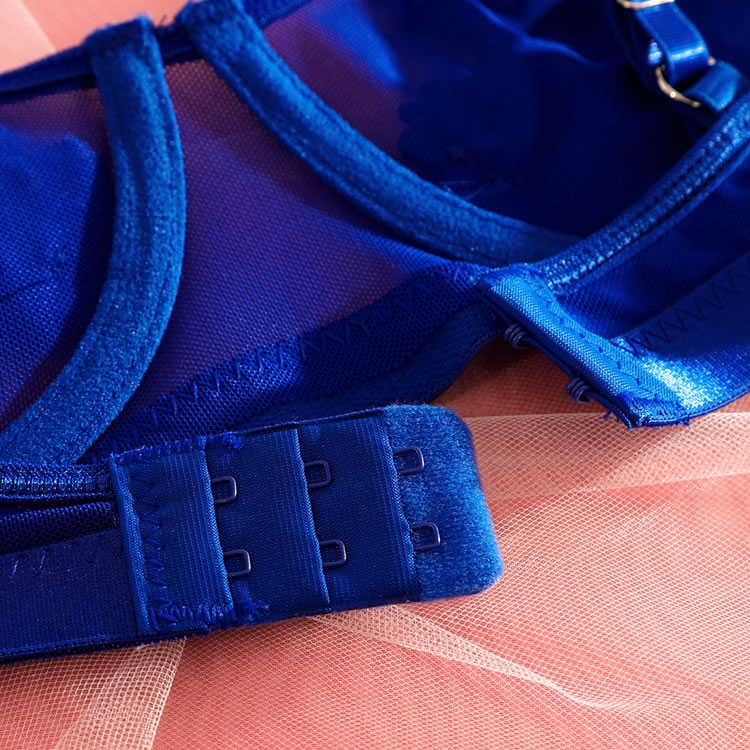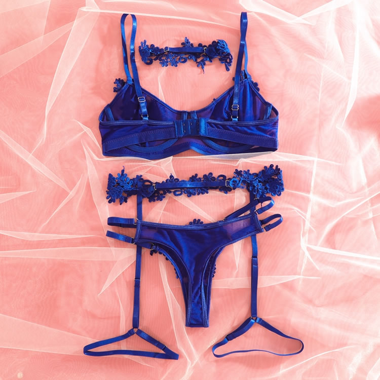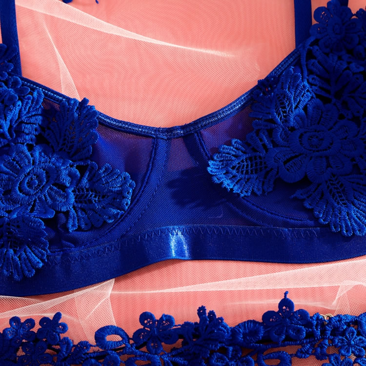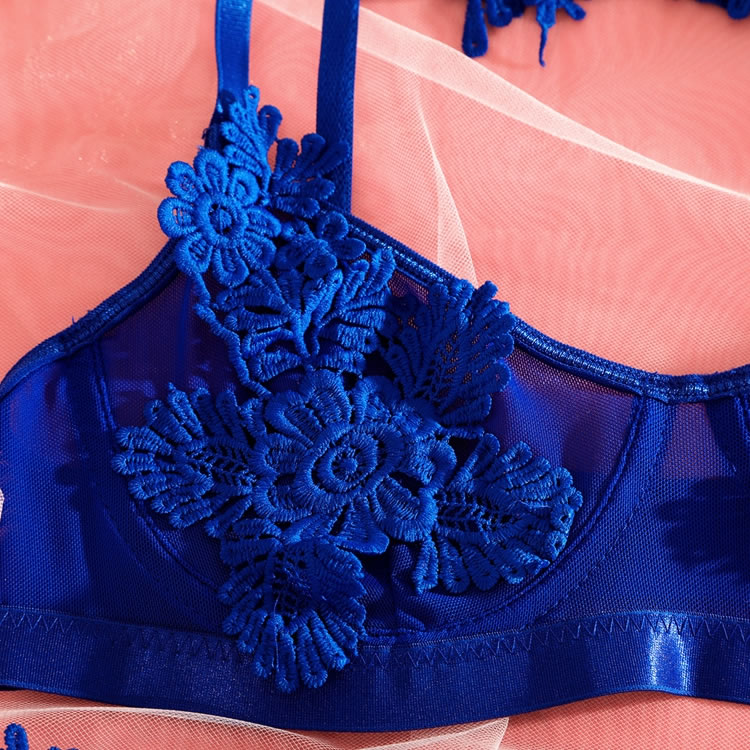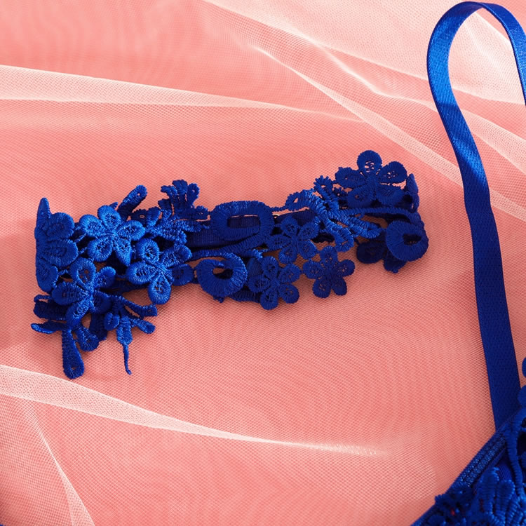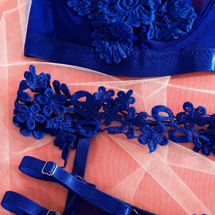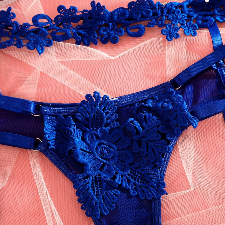 Set the spring tone in this sexy bra set featuring sheer mesh underwire cups with delicate embroidered lace accents, adjustable spaghetti straps, an embroidered floral choker, a hook and eye back closures, a matching garter belt with with adjustable garter straps, wraparound leg garters, and a matching panty.