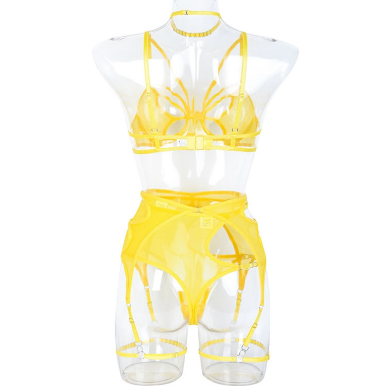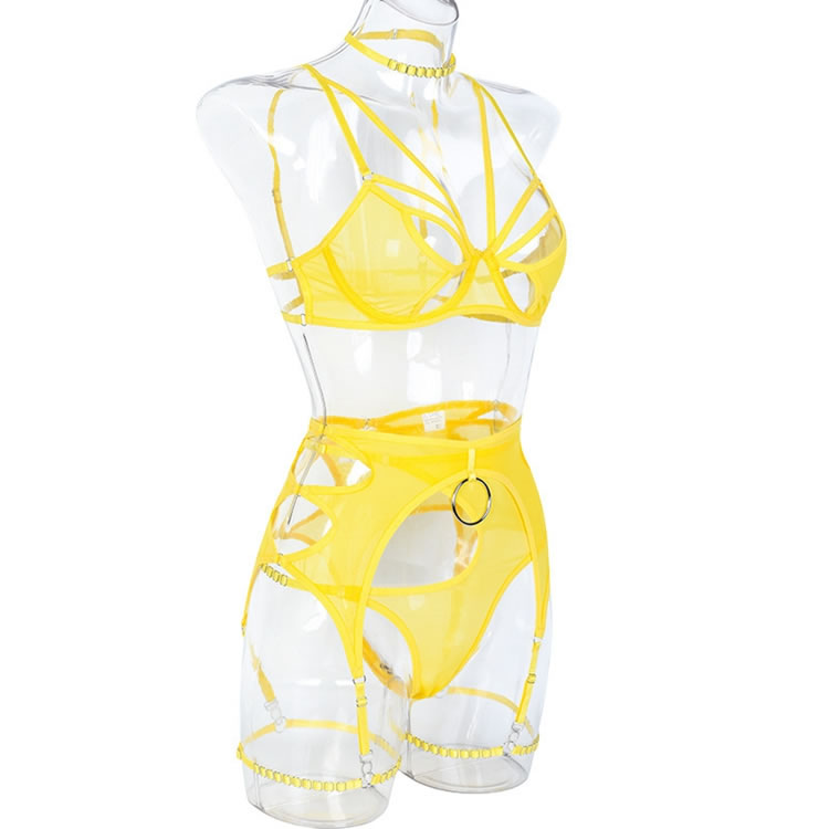 Take the main stage in this provocative dance set featuring sheer mesh peekaboo underwire cups, adjustable spaghetti straps, a cage style back band with hook closures, and a strappy high waist panty with a thong cut back, a matching garter belt with adjustable garter straps, wraparound leg garters. (Choker included.)