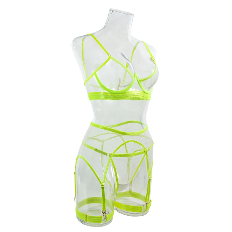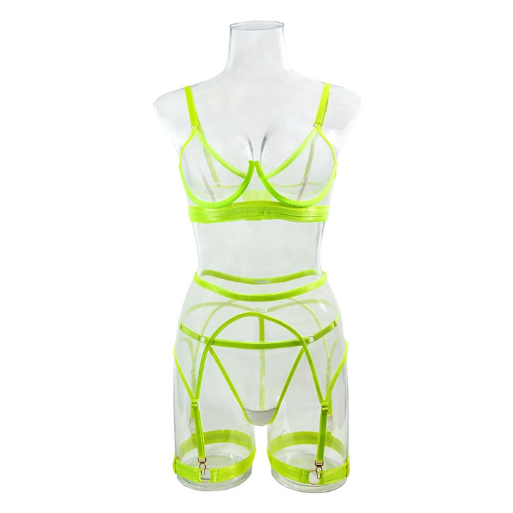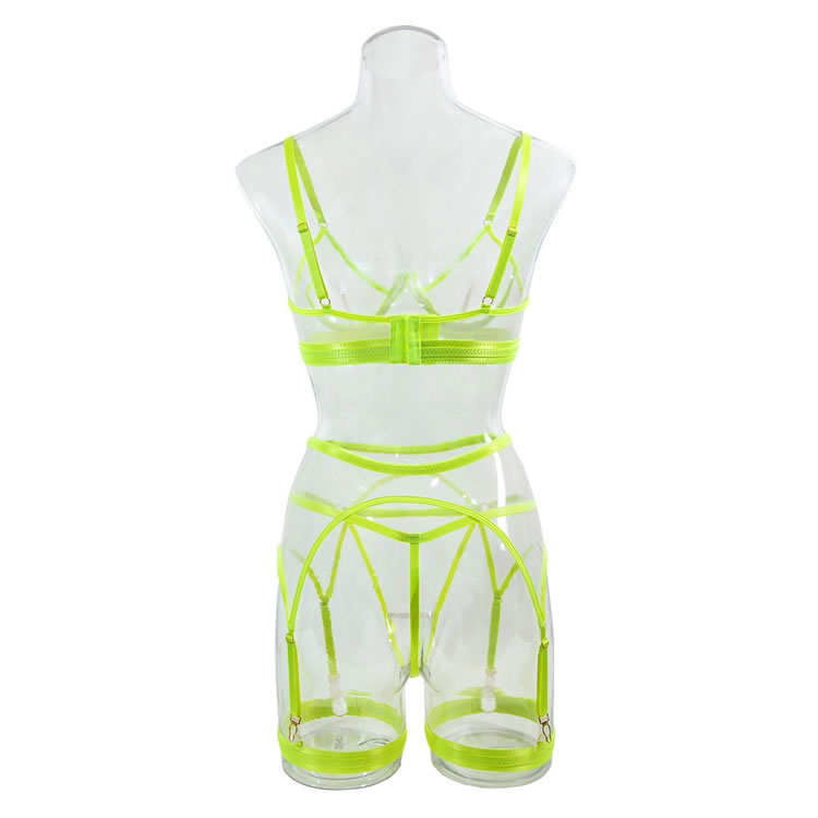 Mesh and straps meet for a sexy encounter in this gorgeous bra set featuring sheer mesh underwire cups, adjustable spaghetti straps, an elastic underbust band with a hook and eye back closure, a matching strappy garter belt with adjustable garter straps, and a matching thong panty.