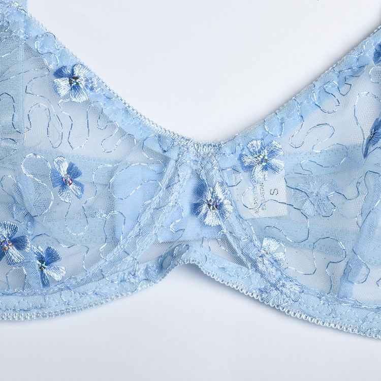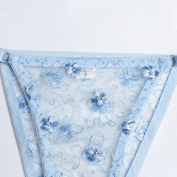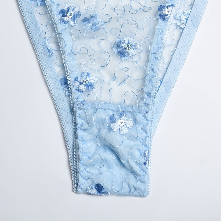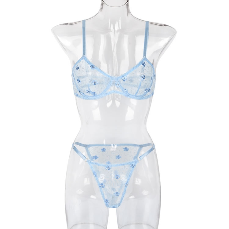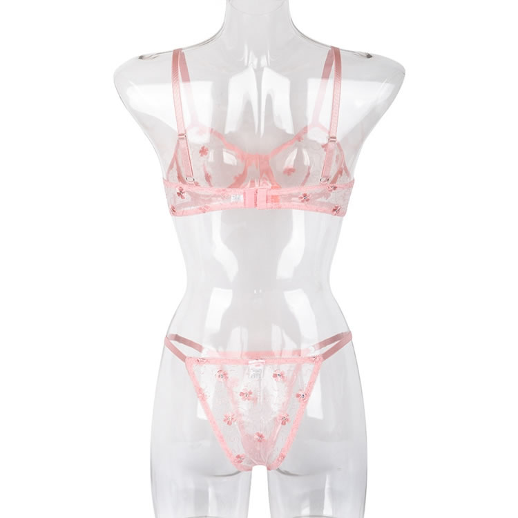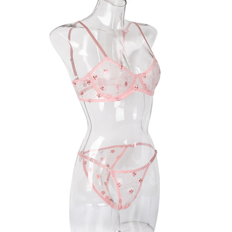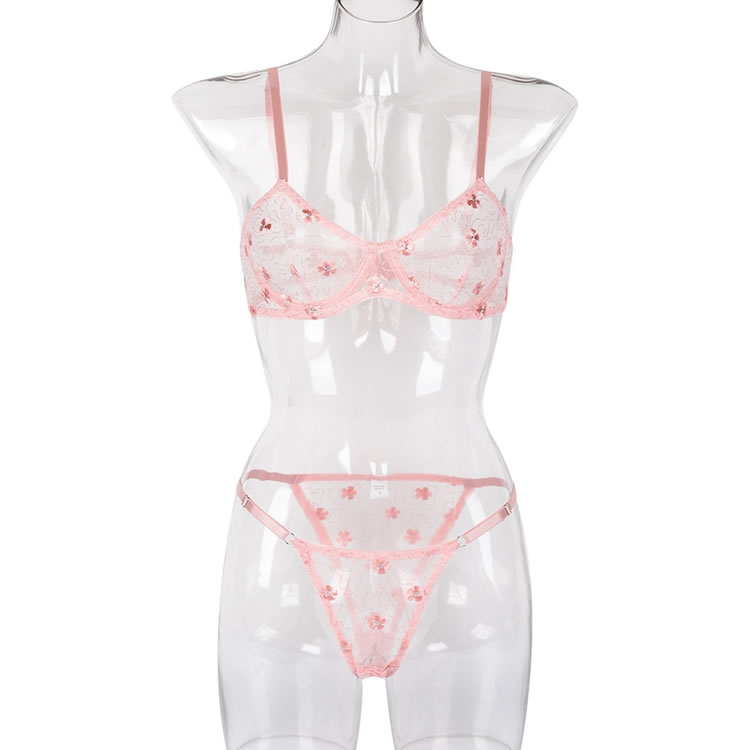 Initiate a romantic evening with your sweetheart in this lovely bra set featuring sheer mesh underwire cups with floral embroidery, adjustable spaghetti straps, a hook and eye back closure, and a matching panty.