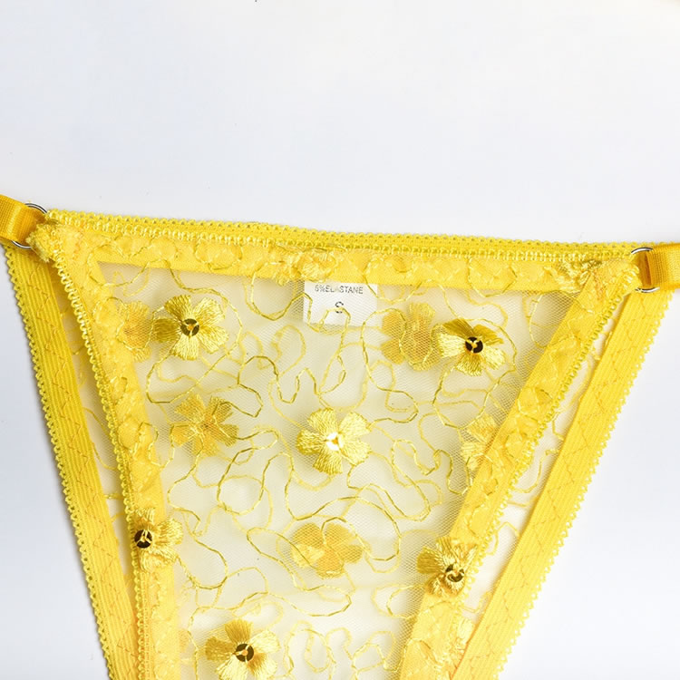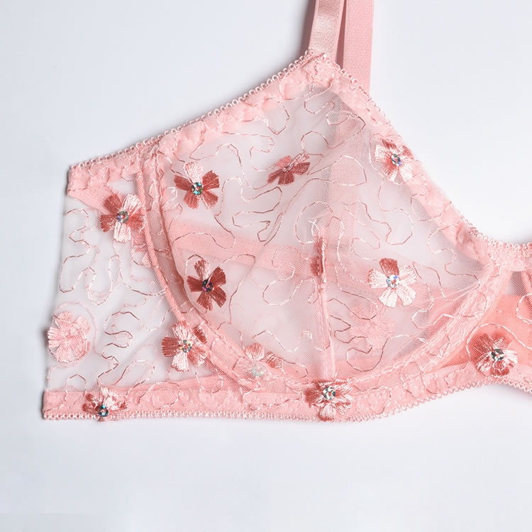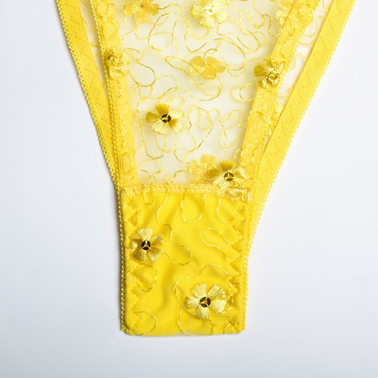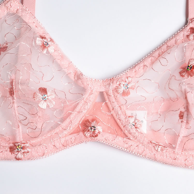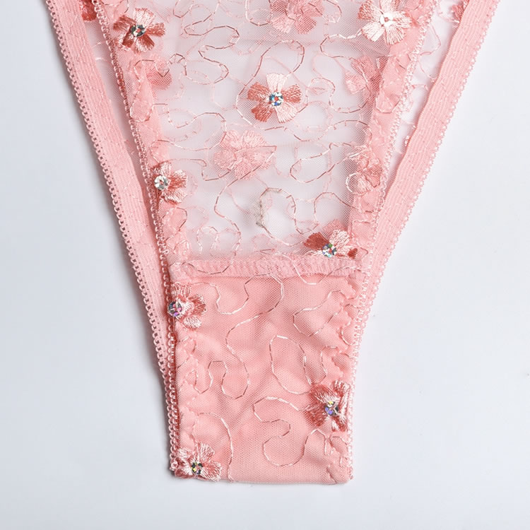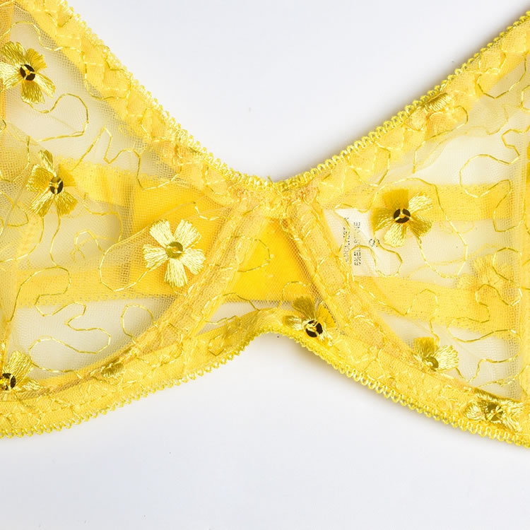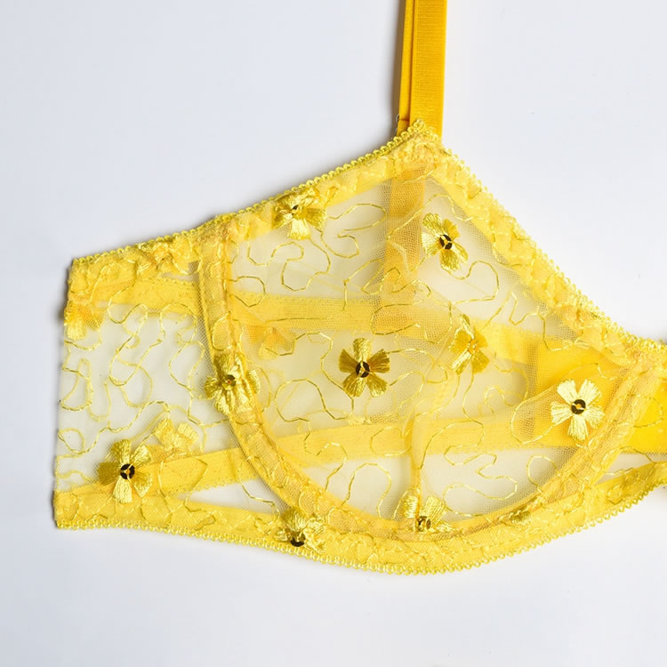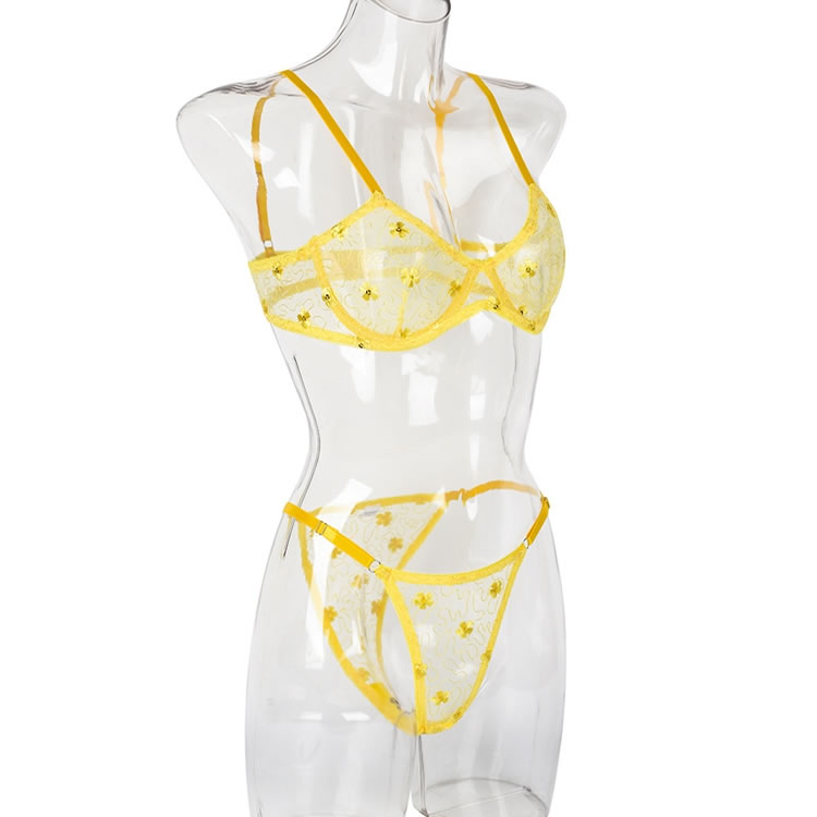 Initiate a romantic evening with your sweetheart in this lovely bra set featuring sheer mesh underwire cups with floral embroidery, adjustable spaghetti straps, a hook and eye back closure, and a matching panty.