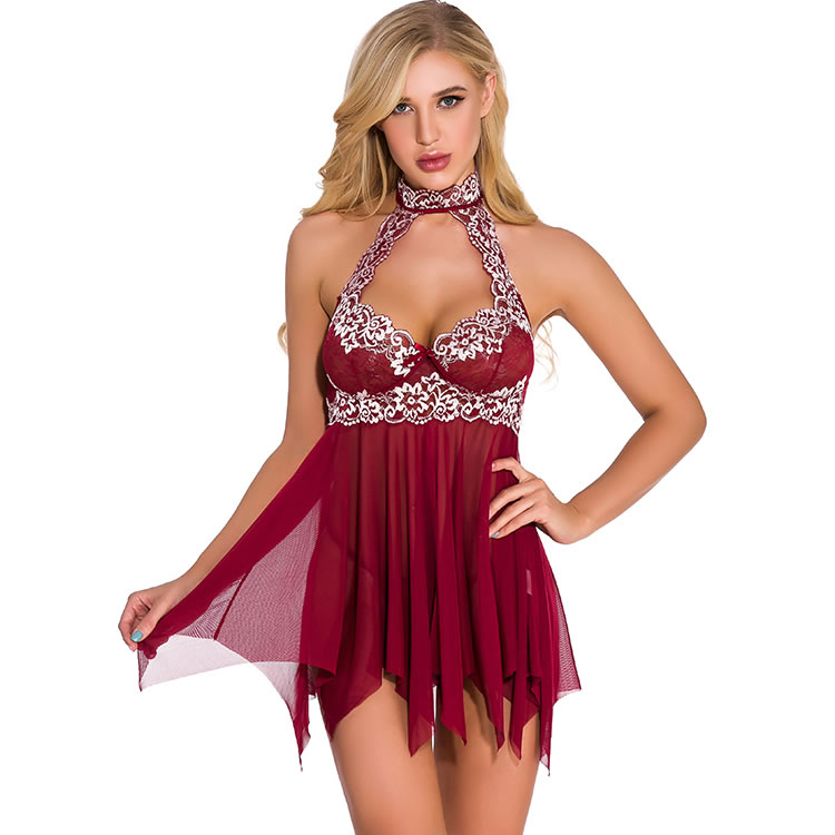 Step into the room with a sexy, ethereal presence in this sassy babydoll set featuring sheer lace cups with a scalloped trim, a high neckline with a keyhole, halter ties, a loose mesh bodice with a vented open front, an asymmetrical hem, and a matching thong panty.