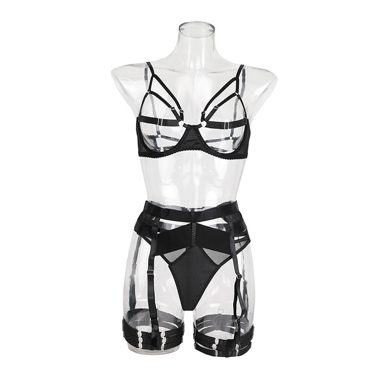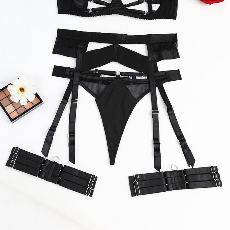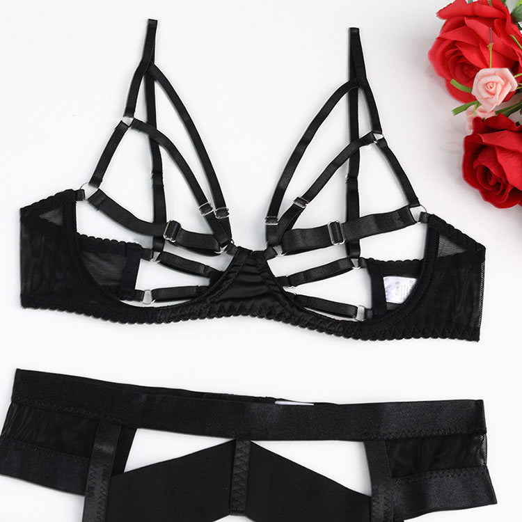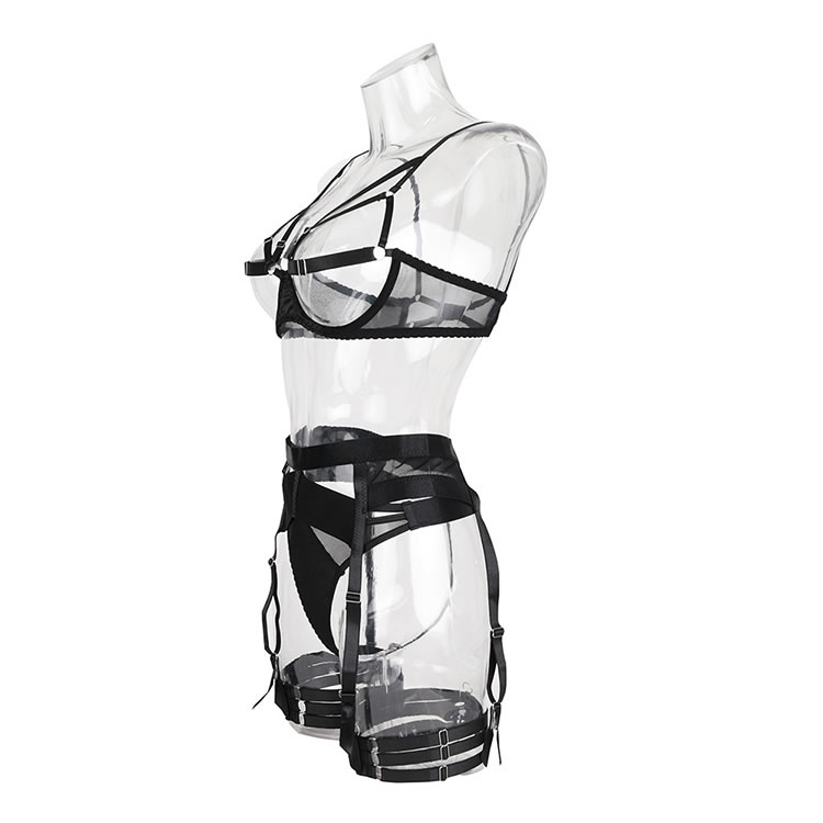 Embrace the allure of romance with this enticing bra set. Featuring open strappy underwire cups, adjustable spaghetti straps, and a convenient hook back closure, this set exudes seduction. The matching high-waisted garter belt with adjustable garter straps and wraparound leg garters adds a daring touch, while the coordinating thong panty completes the ensemble. Perfect for setting the mood, this provocative set is sure to leave a lasting impression.