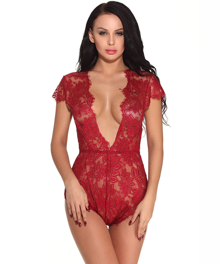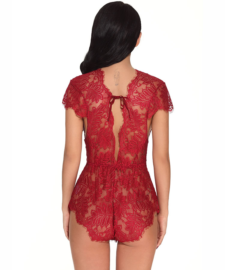 This romantic and sexy eyelash lace romper features a plunging V-neckline, cap sleeves, a sheer bodice, a scalloped trim, a waistband, a low-cut back with a tie closure, and soft shorts.
