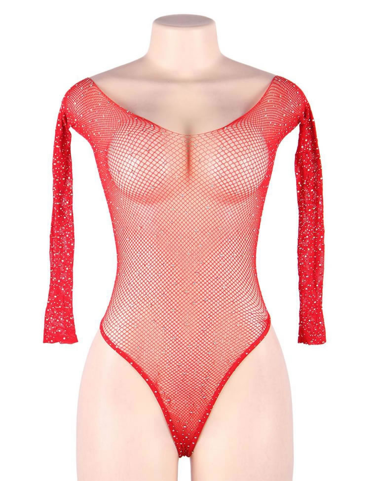 Slay all day in this sexy bodysuit featuring an all over sheer fishnet, a strapless style, fitted long sleeves, pretty crystal accents, flattering high cut sides, and a cheeky cut back. (G-string not included.)