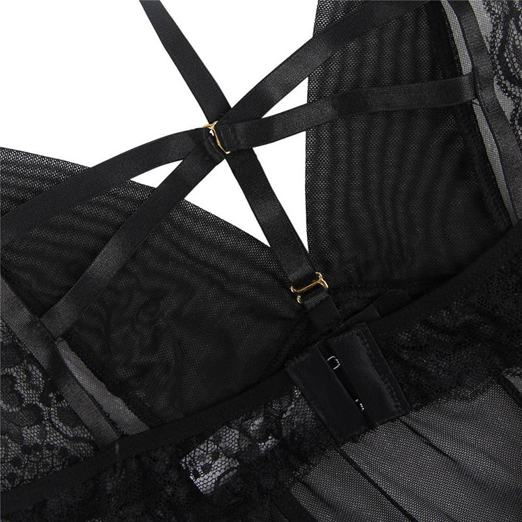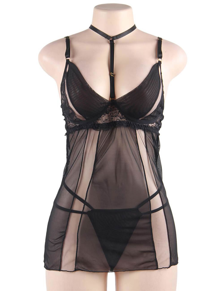 Plus Size Elegant Black Lace Hanging Neck Perspective Sexy Babydoll