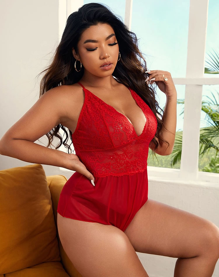 Look hot in and out of the bedroom in this sexy plus size lace bodysuit featuring a V-neckline, adjustable criss-cross spaghetti straps, a sheer bodice, an open back, and a cheeky cut back.