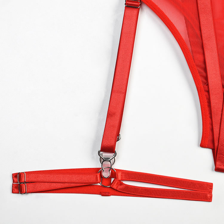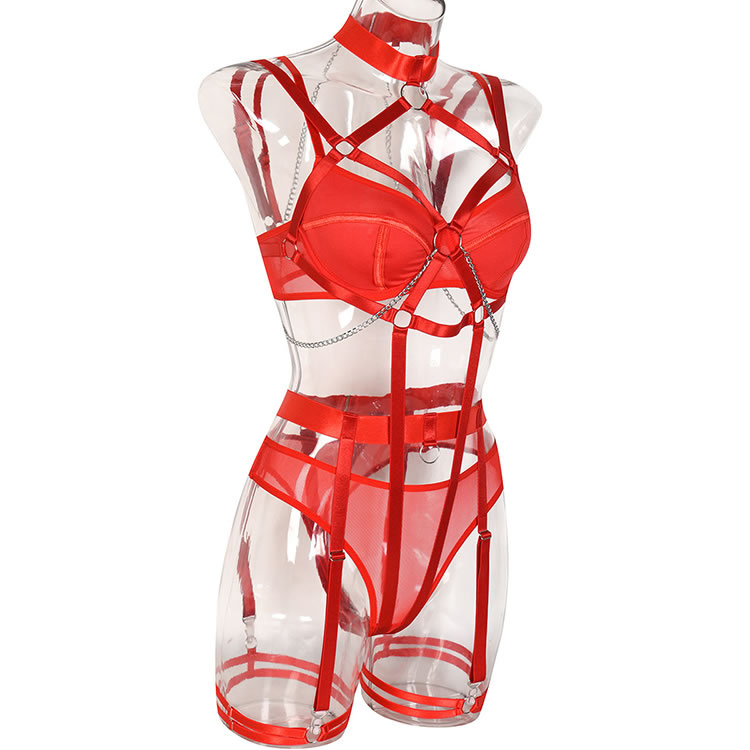 Take your teasing to another level in this ultra sexy harness set featuring open strappy cups, metal O-rings, halter straps, a back hook closure, a matching garter belt with a back hook closure and adjustable strappy garter straps, wraparound leg garters, underwire bra top, adjustable shoulder straps, a hook and eye back closure, and a matching panty.