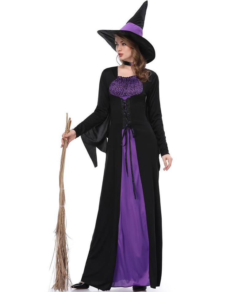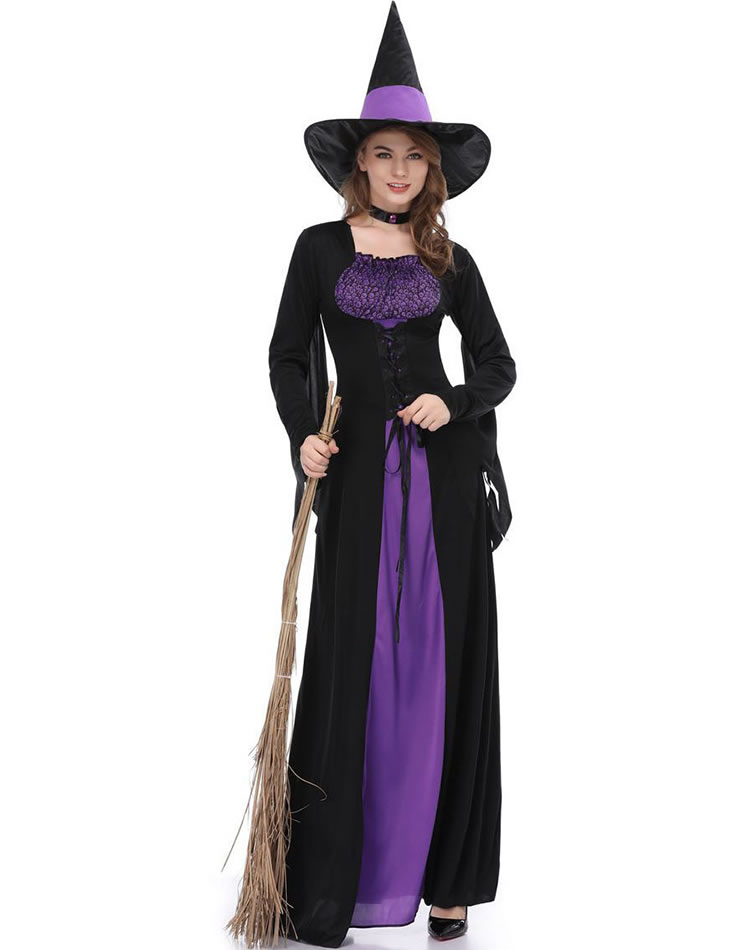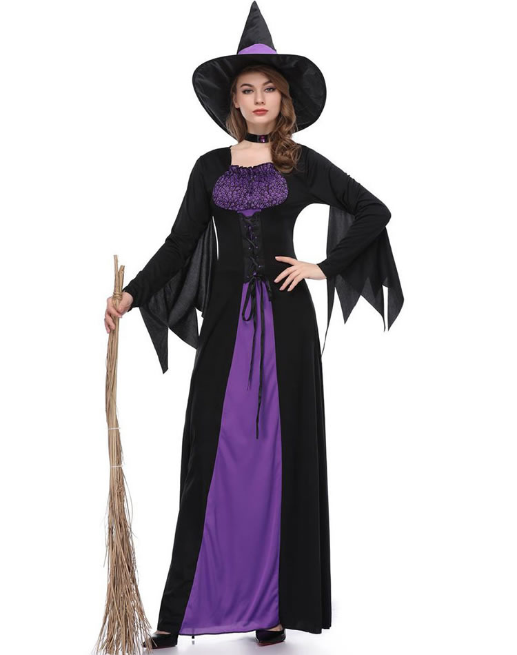 Become the silhouette in the moon in this Rich Witch costume featuring a floor length dress long sleeves with jagged bell cuffs, a choker, and a matching witch hat. (Broom not included).
