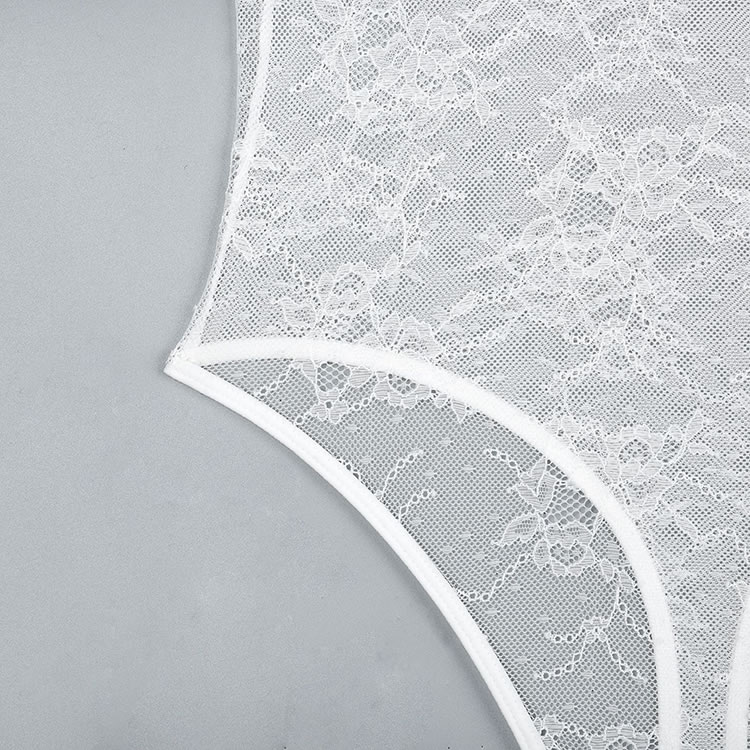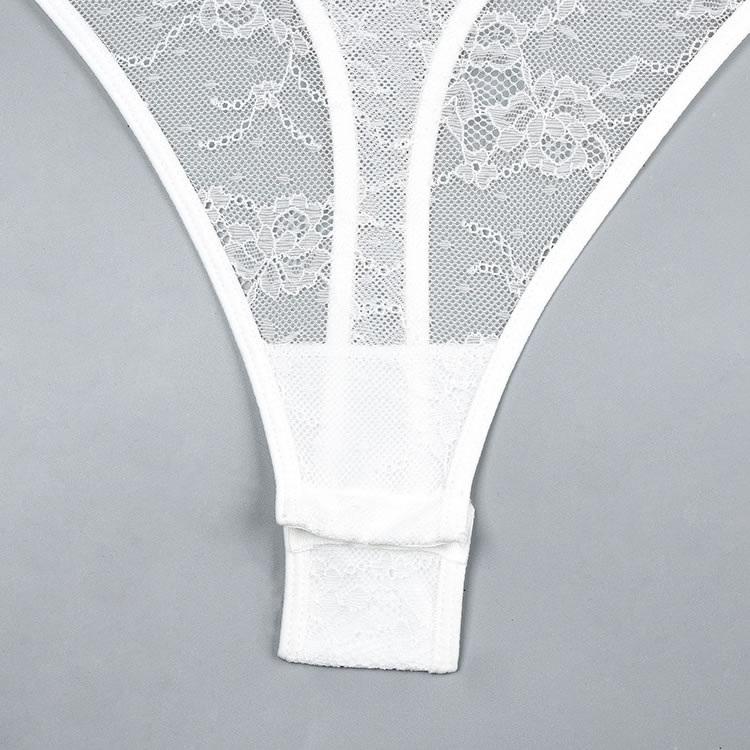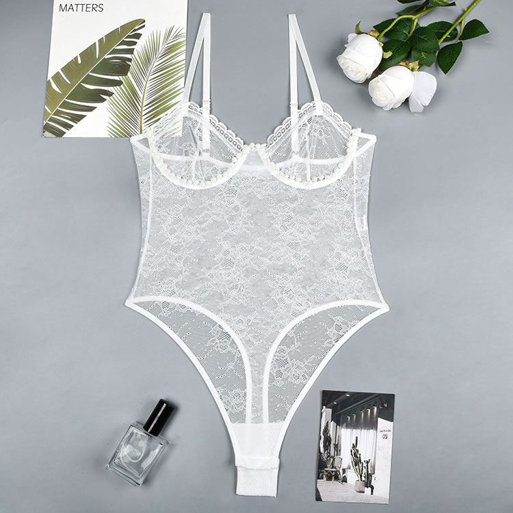 Get your honey a sweet invitation in this sexy teddy featuring sheer lace cups with pearl embellishments, adjustable spaghetti straps, a sheer lace bodice, a high cut leg, a snap crotch, and a thong cut back.