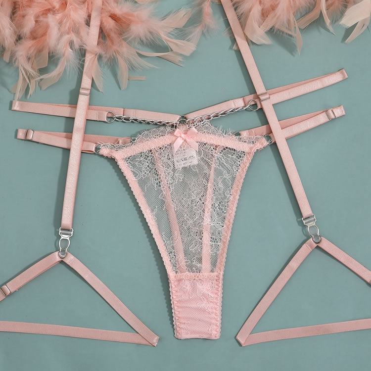 Embrace your most glamorous self in this stunning bra set featuring sheer lace underwire cups with a chain detail, adjustable spaghetti straps, a caged back band with a hook and eye closure, a matching high waisted garter belt with adjustable garter straps, wraparound leg garters, and a matching panty.