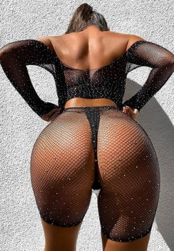 Shine to high heaven in this ultra sexy 2 piece bra set featuring an all over fishnet with sparkling rhinestone accents, a sheer mesh cups fishnet crop top, off-the-shoulder long sleeves, a sheer bodice, and a matching shorts.
