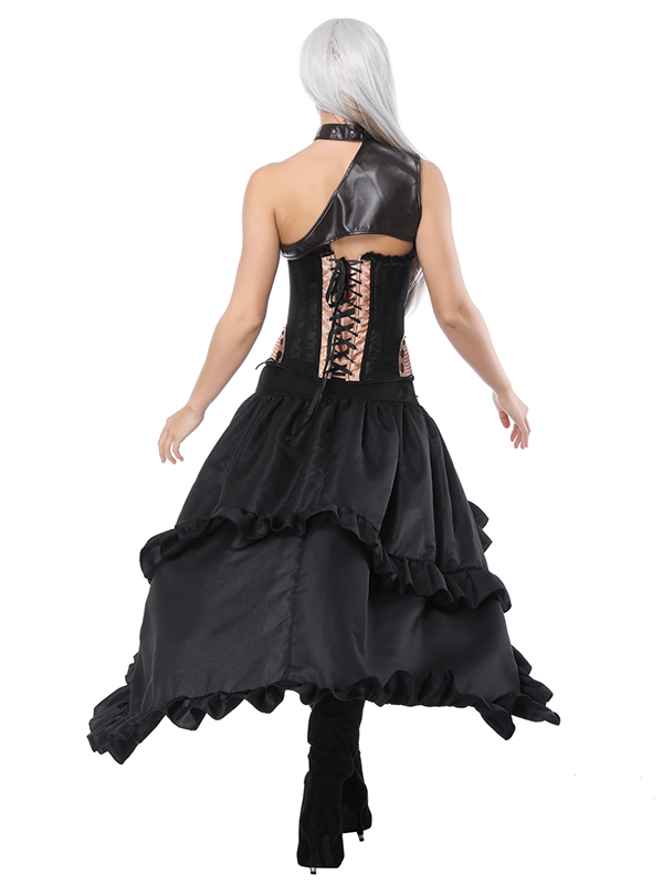 The steampunk corset high low skirt set is suitable for Steampunk-themed, Night Out Dancing, Halloween Party or Other Occasions.