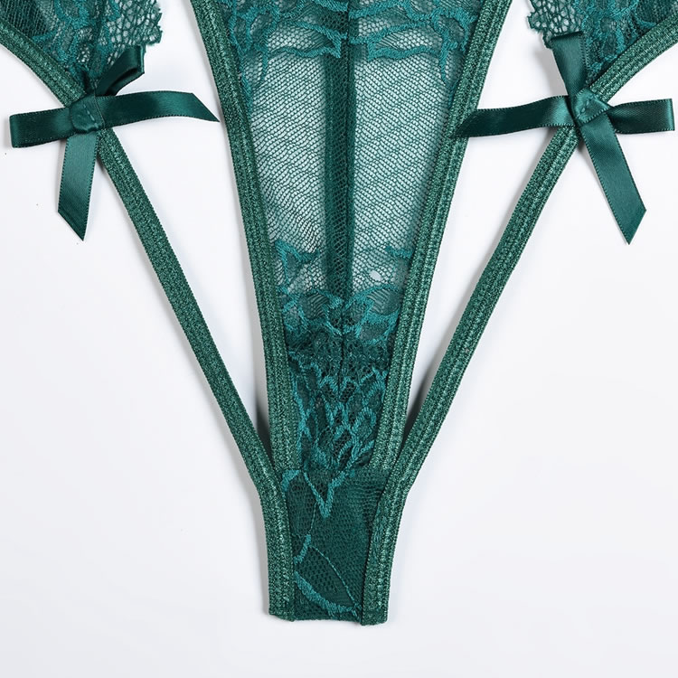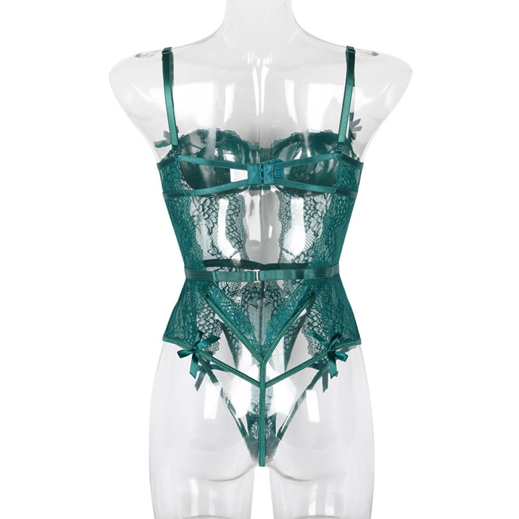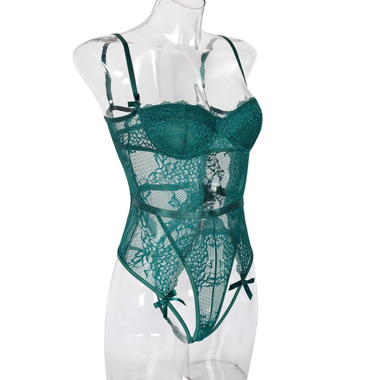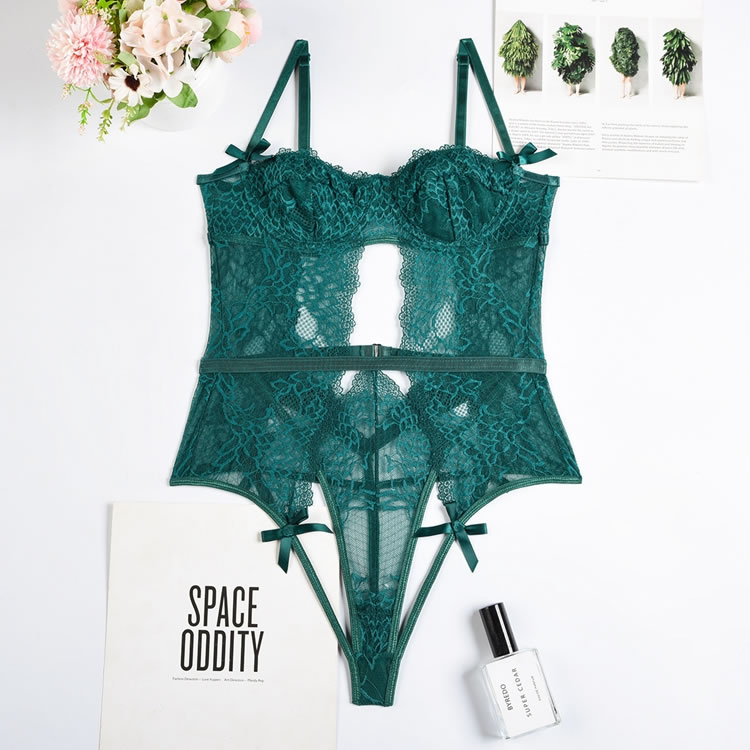 Hit that view count in this sexy lace teddy featuring sexy lace underwire cups, satin bows accents, adjustable spaghetti straps, a back hook closure, a sheer, cut-out lace bodice, an opaque waistband, and a thong cut back.