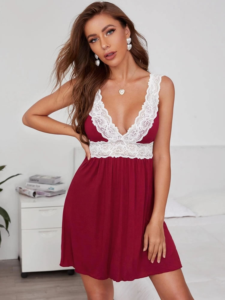 Get lost lounging and loving in this cozy sleep nightgown featuring triangle cups with a white scalloped sheer lace trim, a sheer lace underbust band, and a loose skirt.