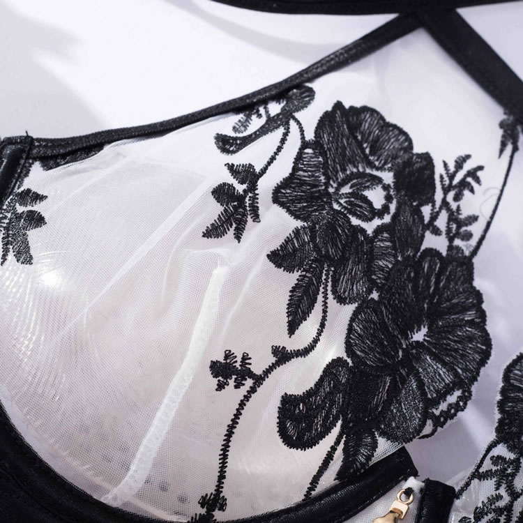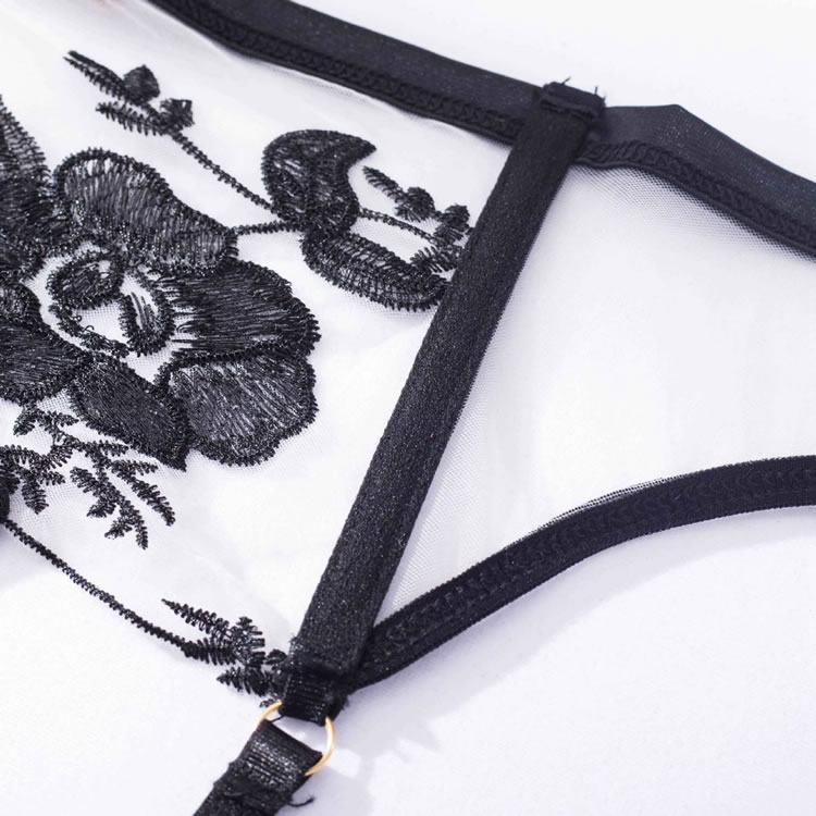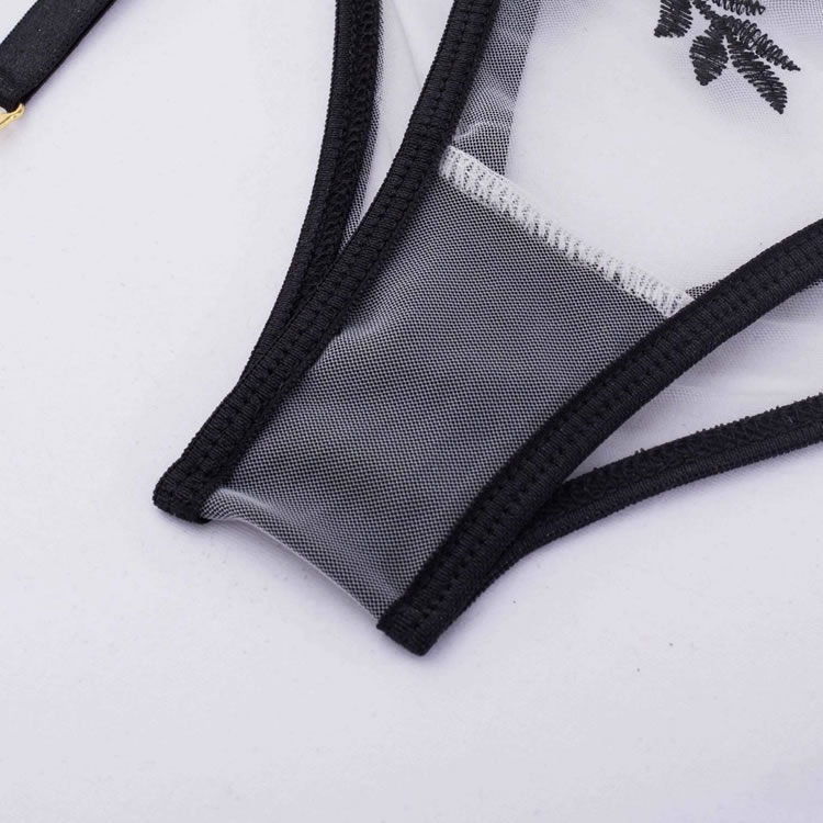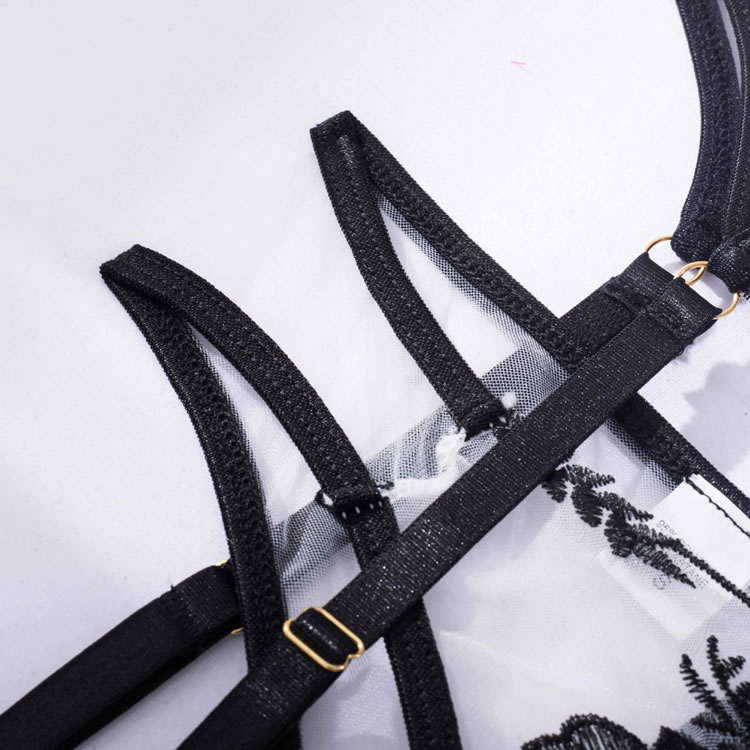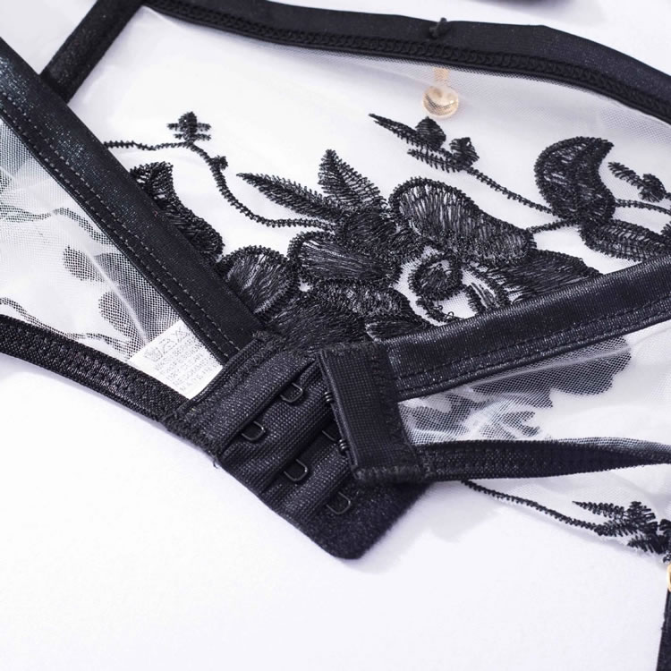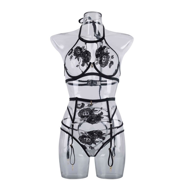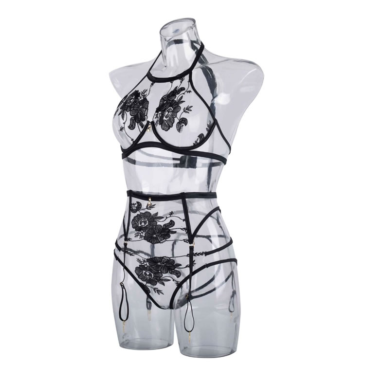Tempt and tease in this exclusive bra set featuring sheer lace underwire cups with a front keyhole opening, halter straps, a hook and eye back closure, a matching garter belt with adjustable garter straps, and a matching panty with an open back.