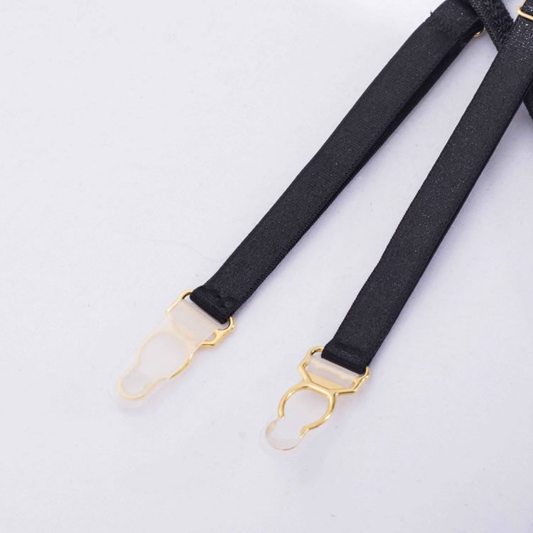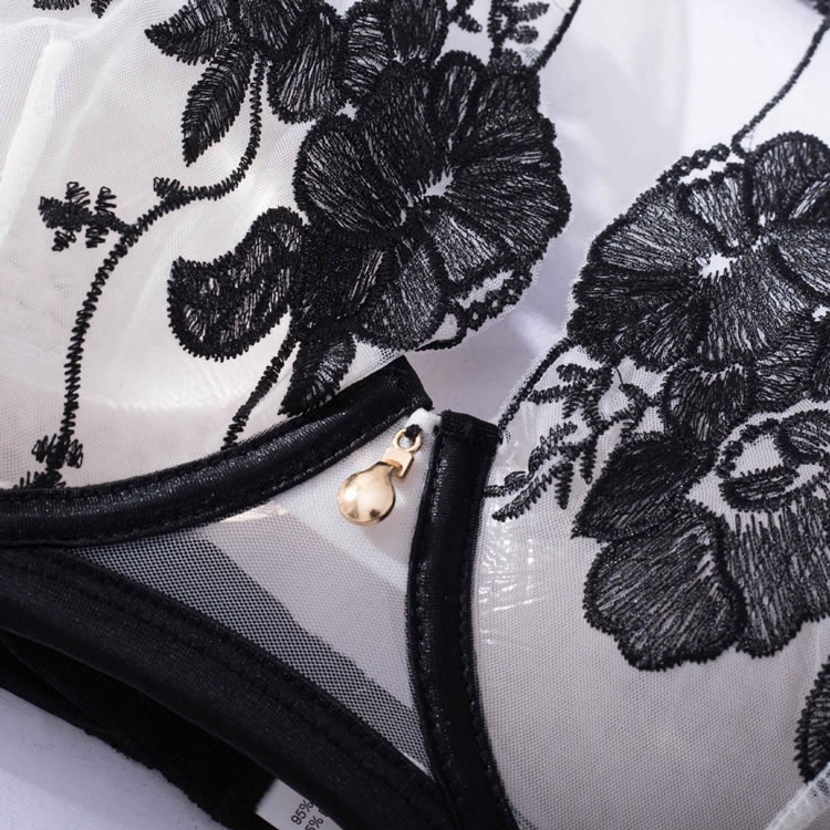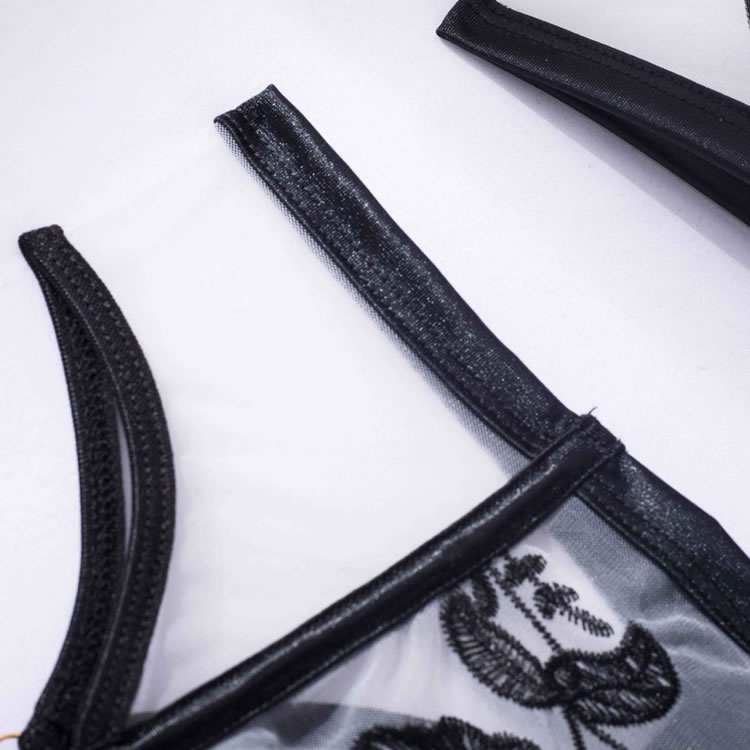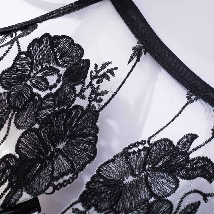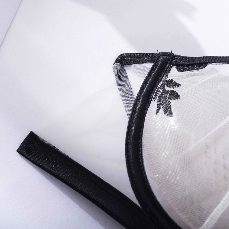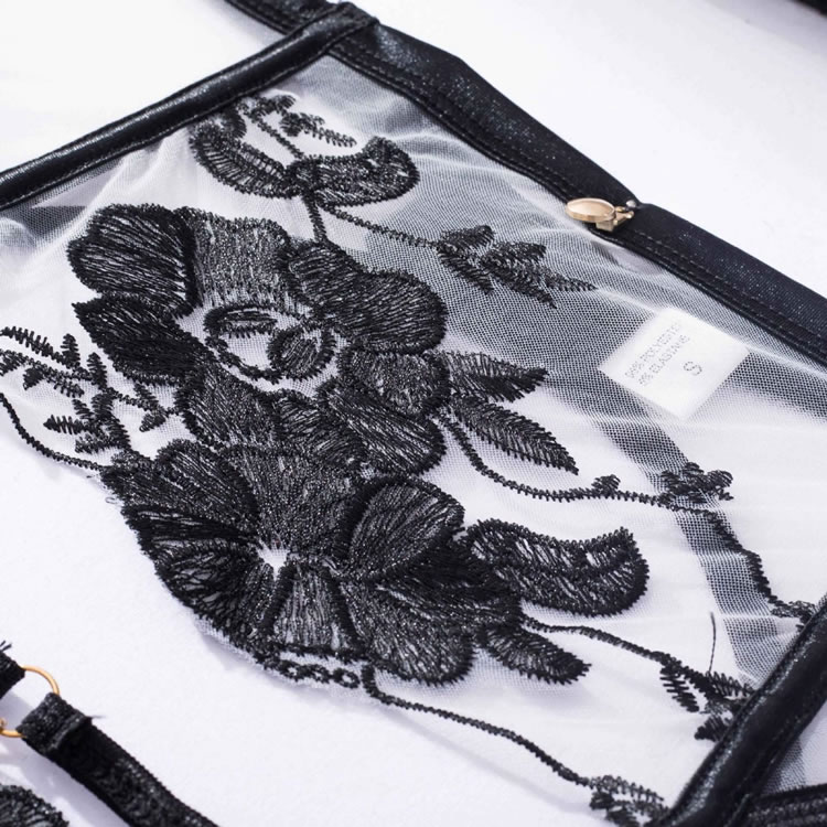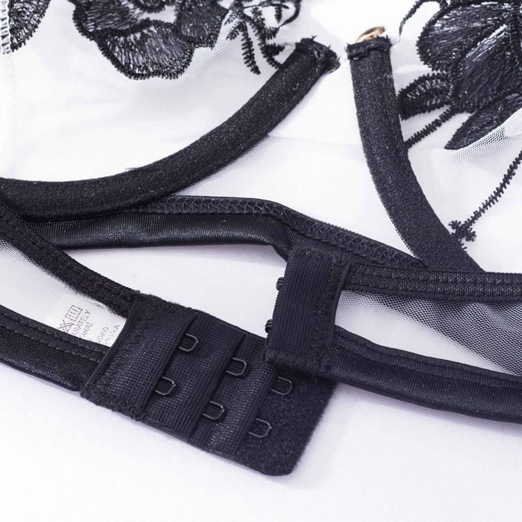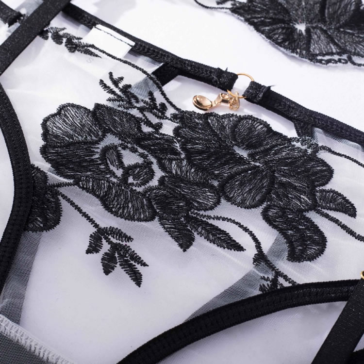 Tempt and tease in this exclusive bra set featuring sheer lace underwire cups with a front keyhole opening, halter straps, a hook and eye back closure, a matching garter belt with adjustable garter straps, and a matching panty with an open back.