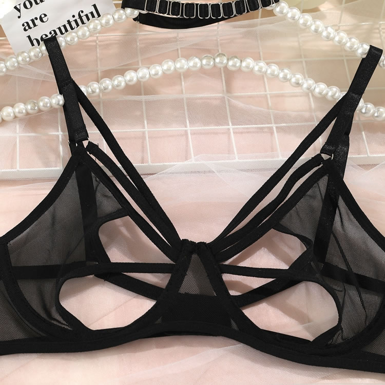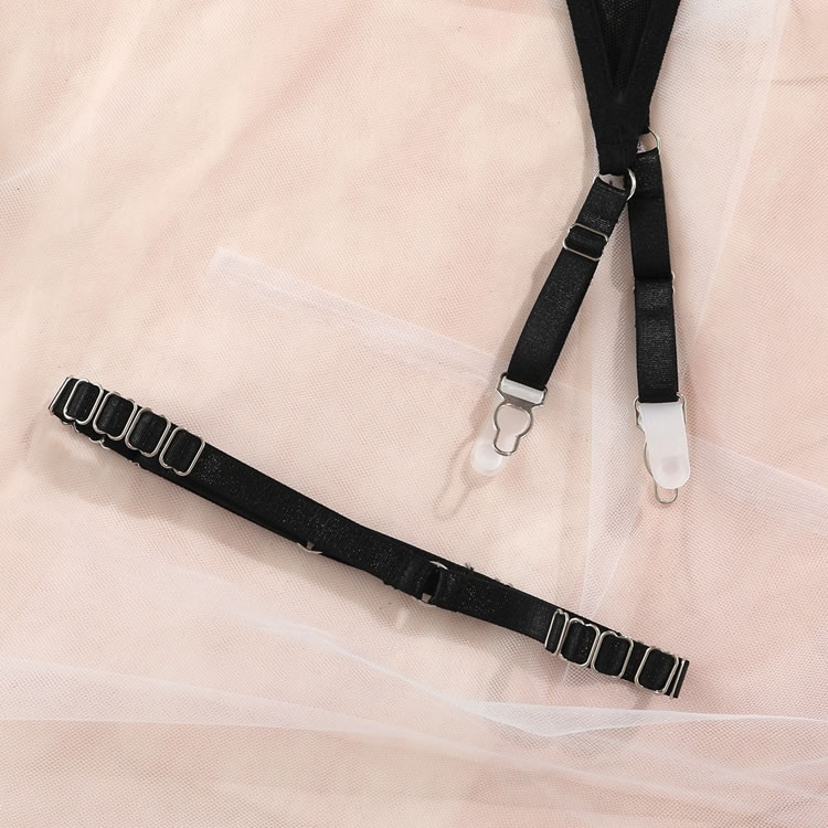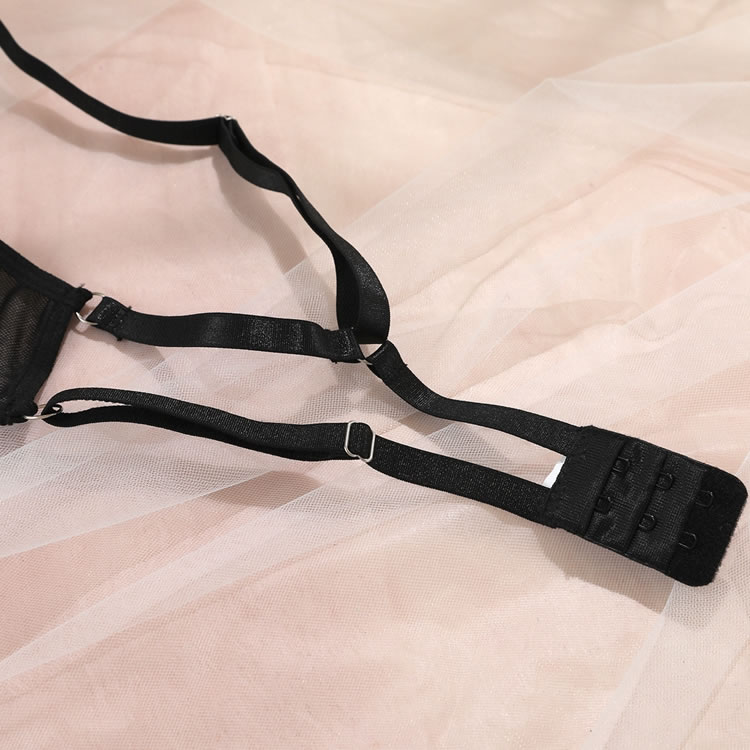 Seduce your sweetie with elegance in this beautiful flocked bra set featuring sheer mesh peekaboo underwire cups, adjustable spaghetti straps, a cage style back band with hook closures, and a strappy high waist panty with a thong cut back, a matching garter belt with adjustable garter straps, wraparound leg garters. (Choker included.)