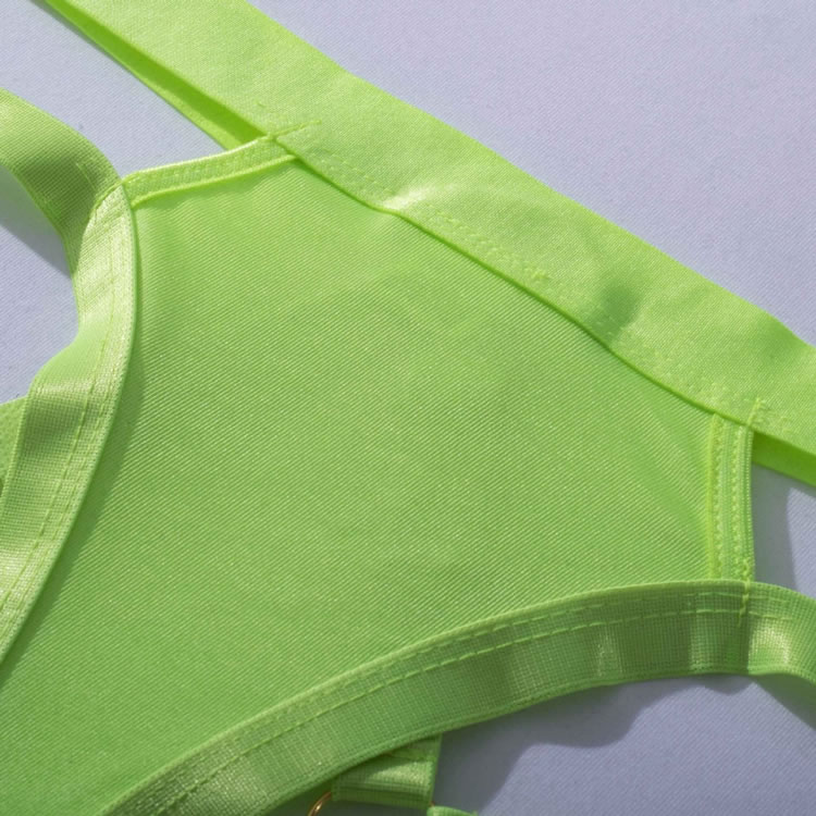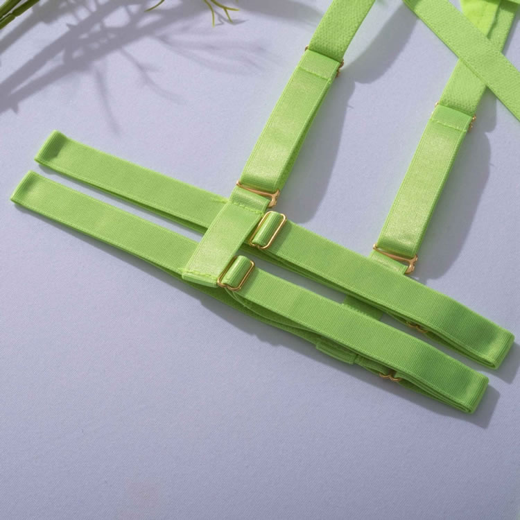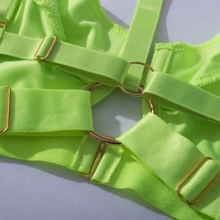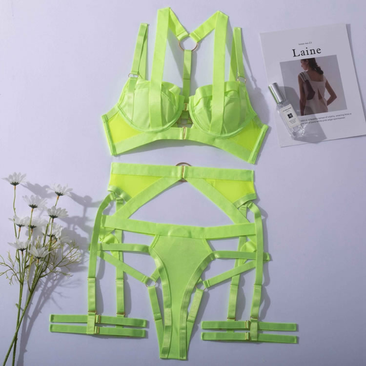 Ultra sexy and daring, this lingerie piece will evoke sensuality in the bedroom. This striking bra set features underwire cups, adjustable shoulder straps, a front hook closure, and a matching caged panty, an open back with framing straps, and a matching garter belt with adjustable garter straps, wraparound leg garters.