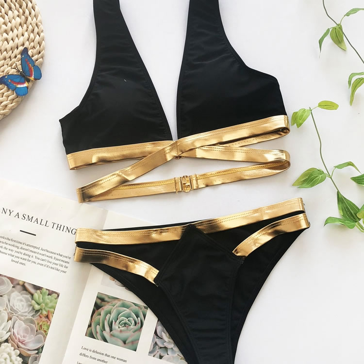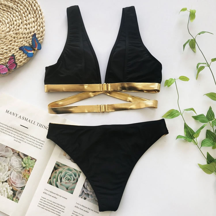 Turn heads at the beach in this fun bikini set featuring black triangle cups with a gold trim, shoulder straps, a strappy underbust band, and matching bottoms with a gold strappy waistband and a full back.