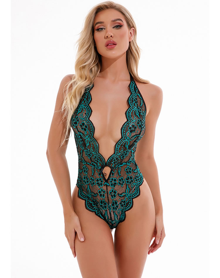 Go for it in this seductive teddy featuring sheer lace cups with a scalloped lace trim, halter ties, a plunging deep V- neckline with a satin bow accent, a sheer lace bodice, and a cheeky cut back.