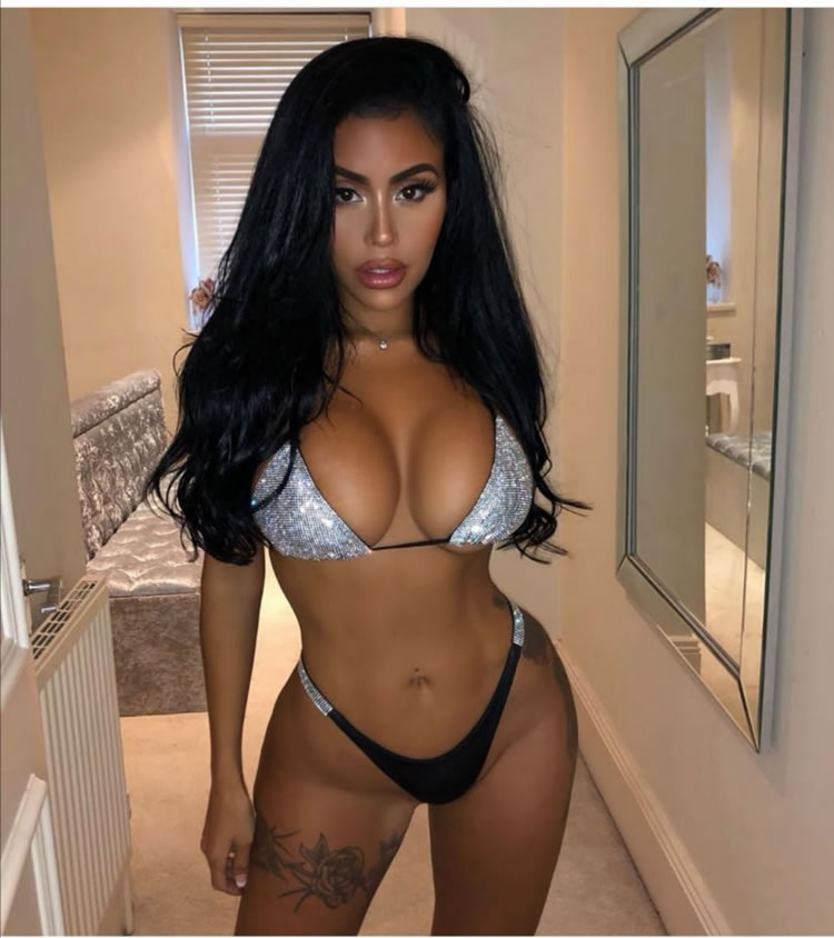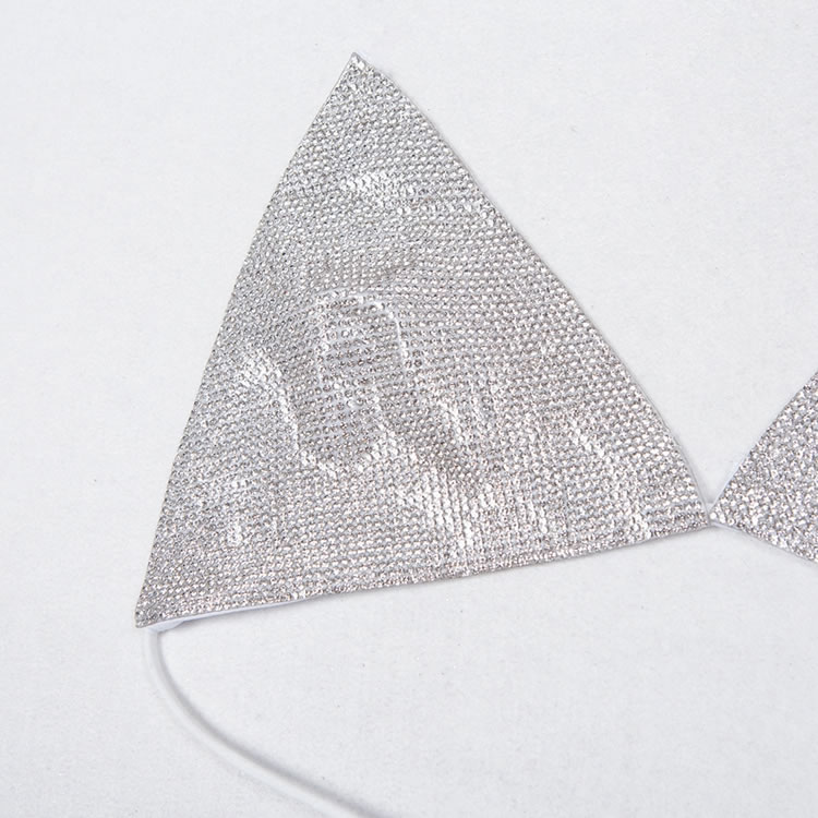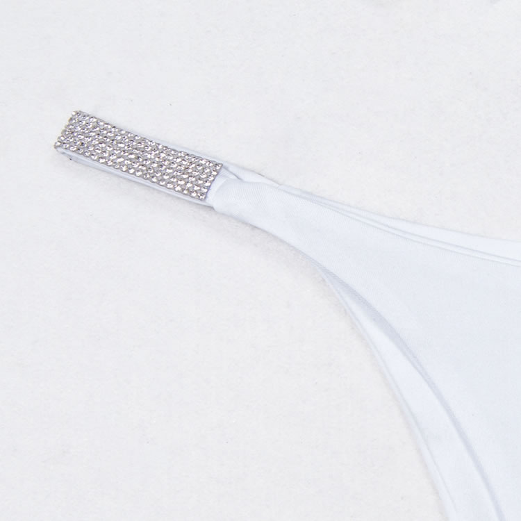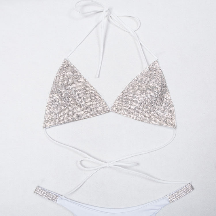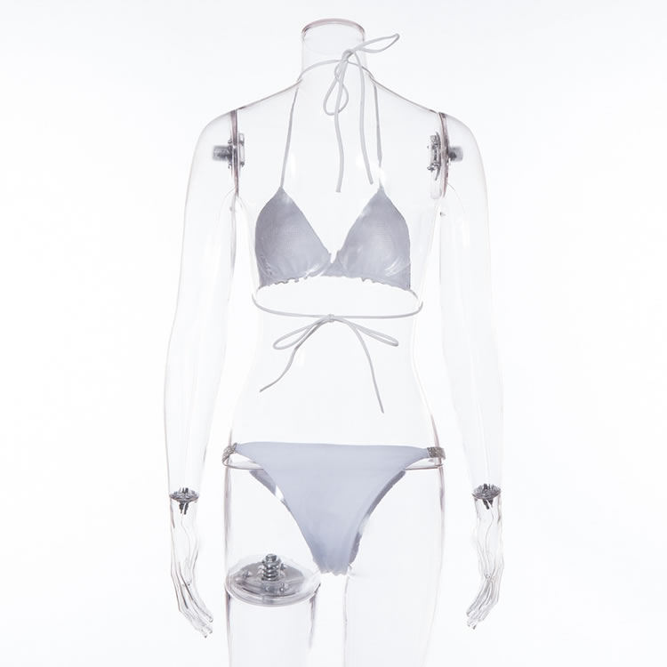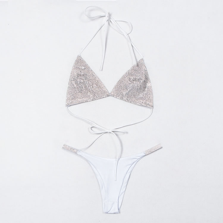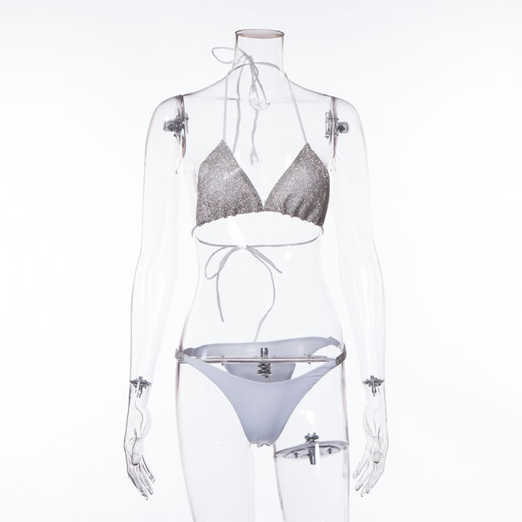 Set the sexy tone in this alluring bikini set featuring rhinestone triangle cups, halter ties, a tie back closure, and a matching bottom with a cheeky cut back.