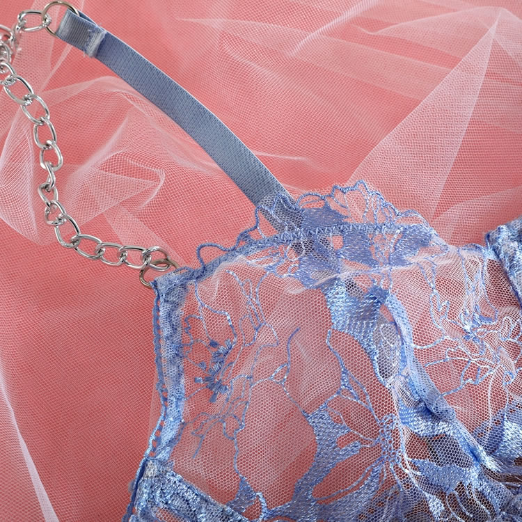 Long for sexy love in this stunning lace bra set featuring sheer lace underwire cups, adjustable spaghetti straps with a chain detail, a hook and eye back closure, a matching garter belt with adjustable garter straps, wraparound leg garters, and a matching panty with a thong cut back.