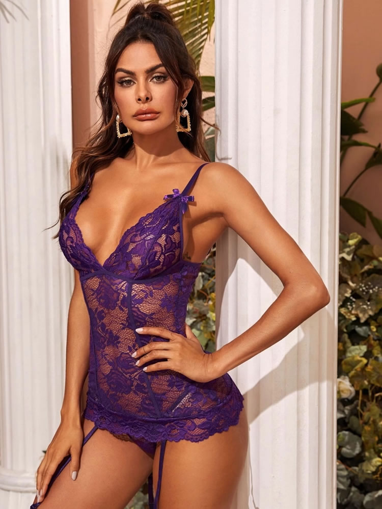Twist sweet with sexy in this lace chemise set featuring sheer lace cups, a scalloped trim, adjustable spaghetti straps, satin bow accents, a strappy open back with a hook and eye closure, a matching panty with an open back panel with satin bow accents, a cheeky cut back with a scalloped trim, and adjustable garter straps. (stockings not included)