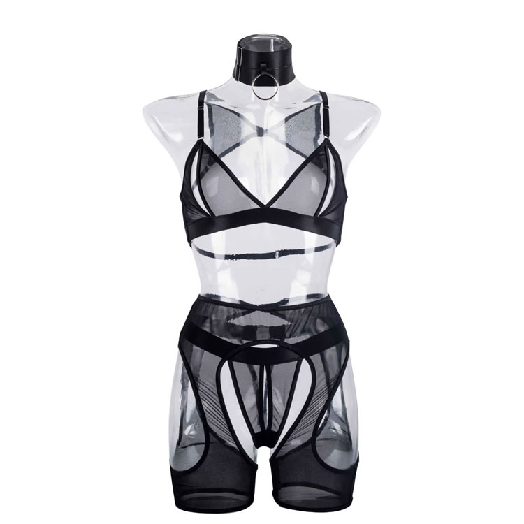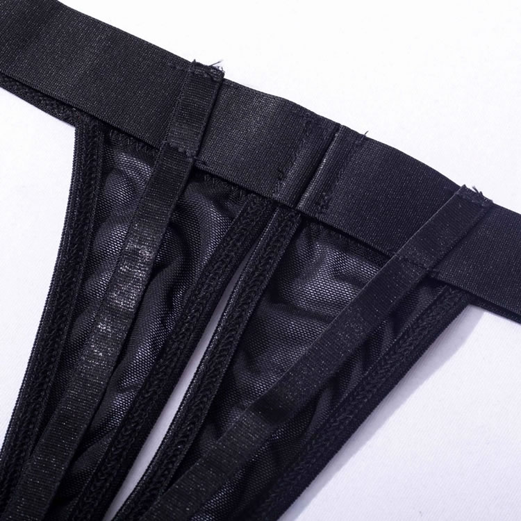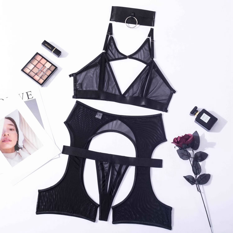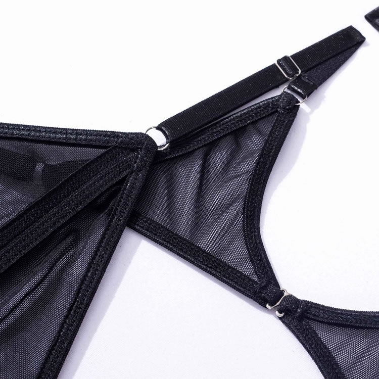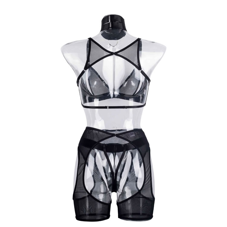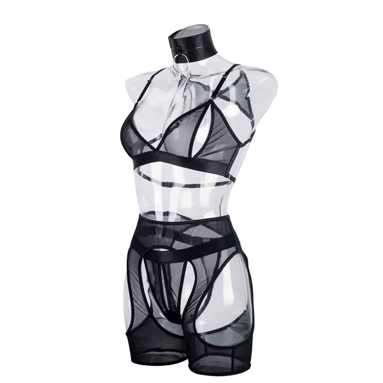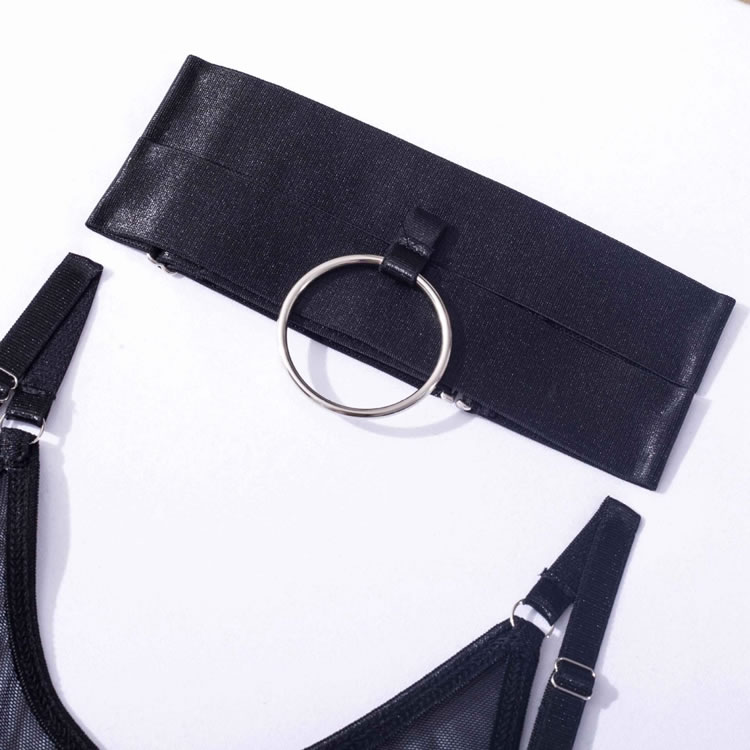 Embrace your playful side in this flirty bra set featuring sheer lace peek-a-boo open cups, a strappy racerback, a matching high waisted garter belt with wraparound leg garters, and a matching panty with a strappy waistband and a thong cut back.
