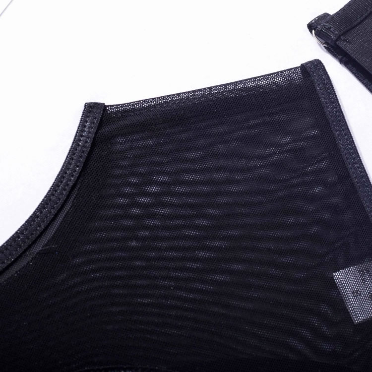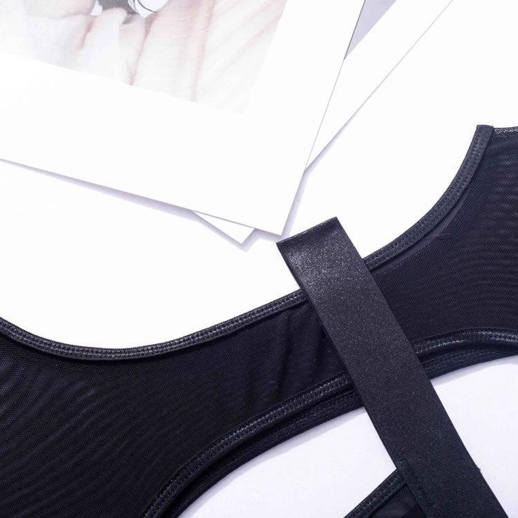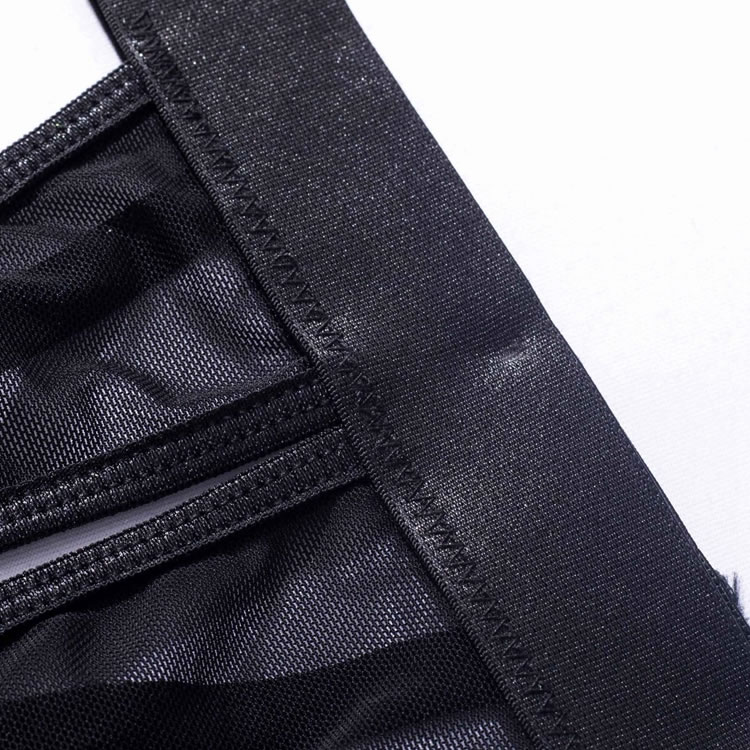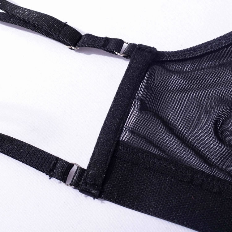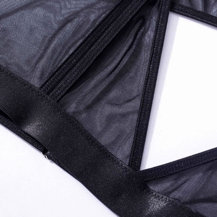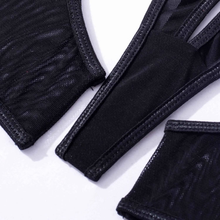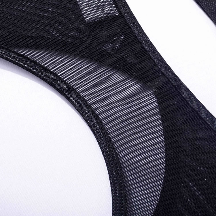 Embrace your playful side in this flirty bra set featuring sheer lace peek-a-boo open cups, a strappy racerback, a matching high waisted garter belt with wraparound leg garters, and a matching panty with a strappy waistband and a thong cut back.