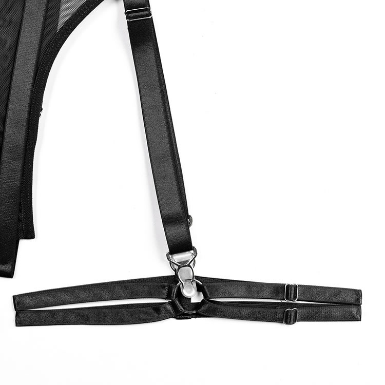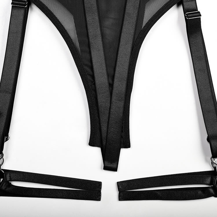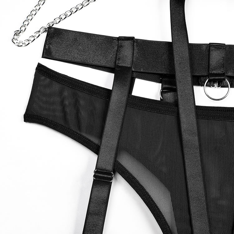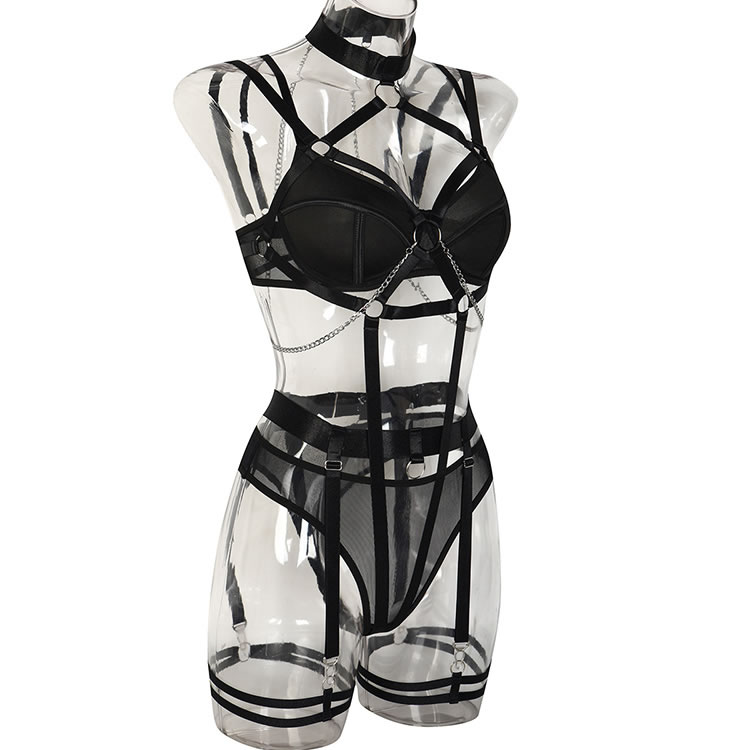 Look beautiful even behind bars in this ultra sexy cage bra set featuring open strappy cups, metal O-rings, halter straps, a back hook closure, a matching garter belt with a back hook closure and adjustable strappy garter straps, wraparound leg garters, underwire bra top, adjustable shoulder straps, a hook and eye back closure, and a matching panty.