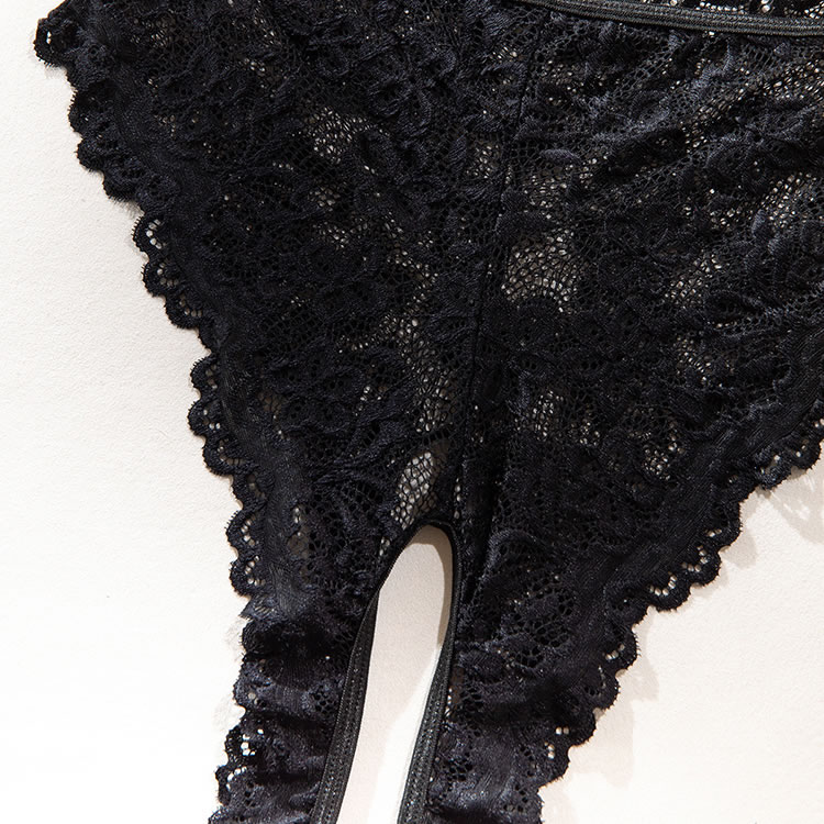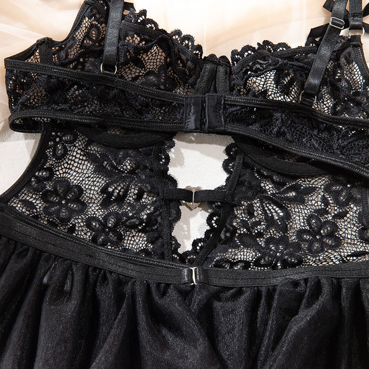 Go all the way for love in this enticing teddy featuring sheer lace underwire cups, adjustable spaghetti straps, a sheer bodice, a hook and eye back closure, an open crotch, a cheeky cut back, and a matching mini skirt.