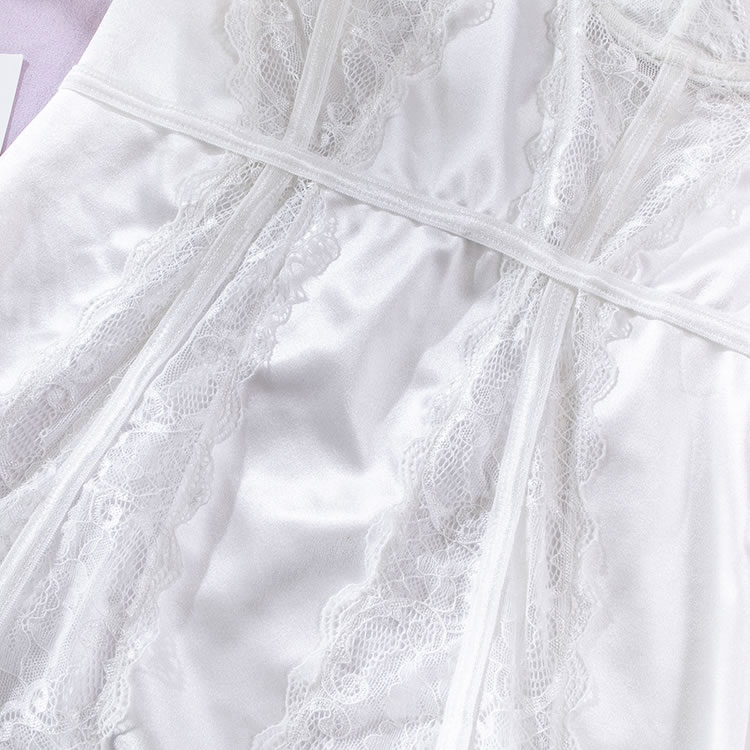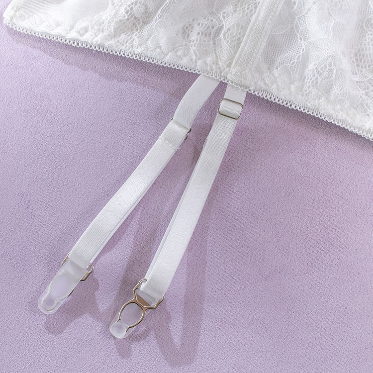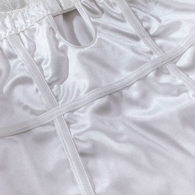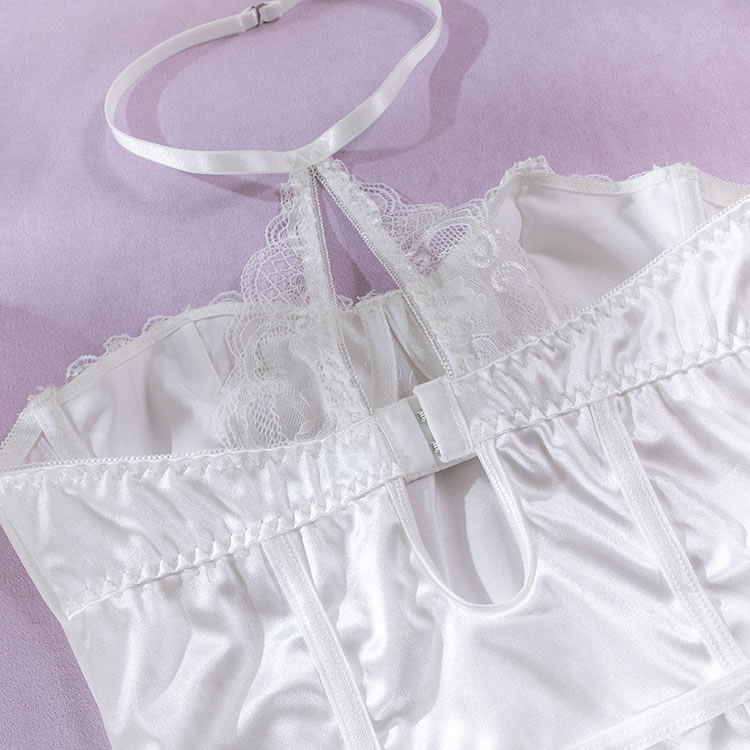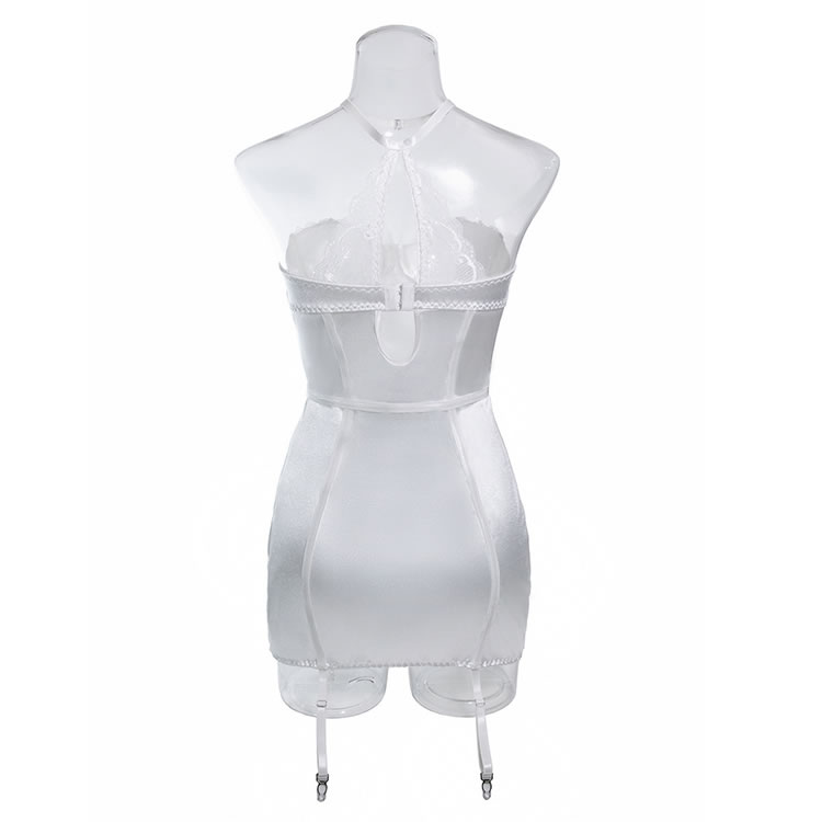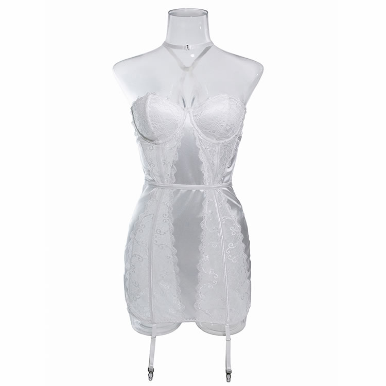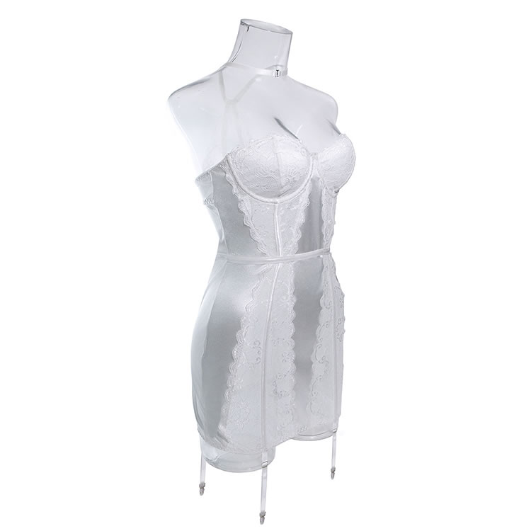 She might look sweet, but she's oh so daring in this sultry chemise set featuring soft lace underwire cups, a high choker neckline, a soild bodice with sheer lace sides panels, a hook and eye back closure with a keyhole, and adjustable garter straps.