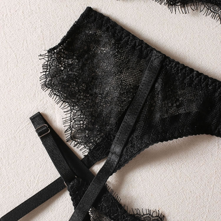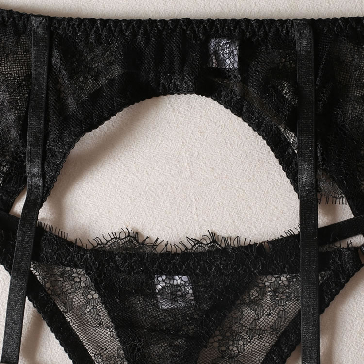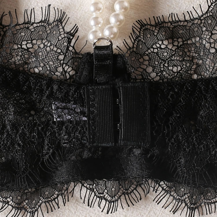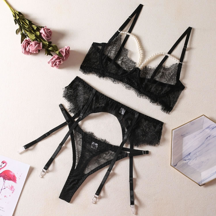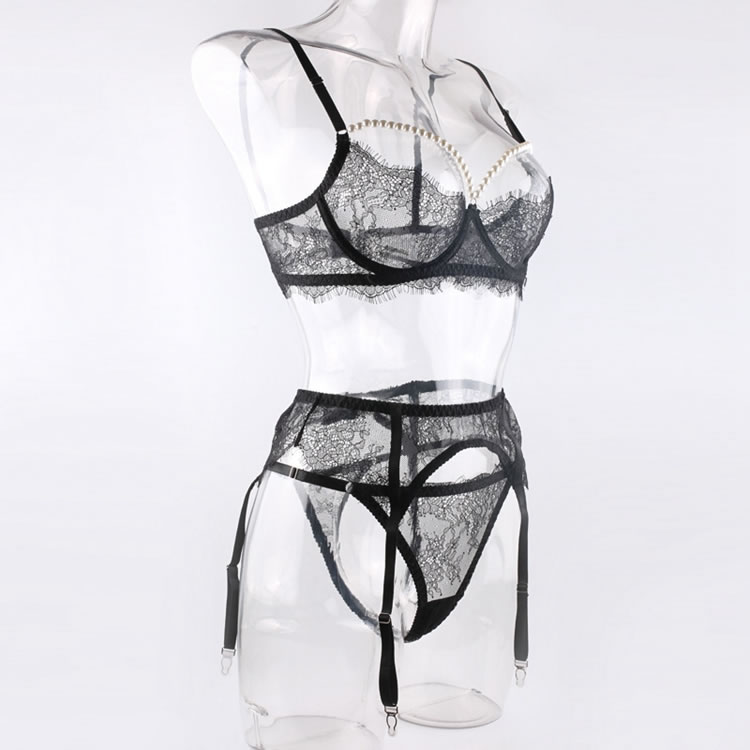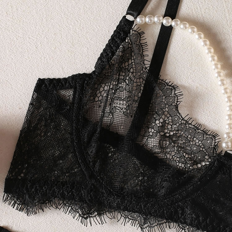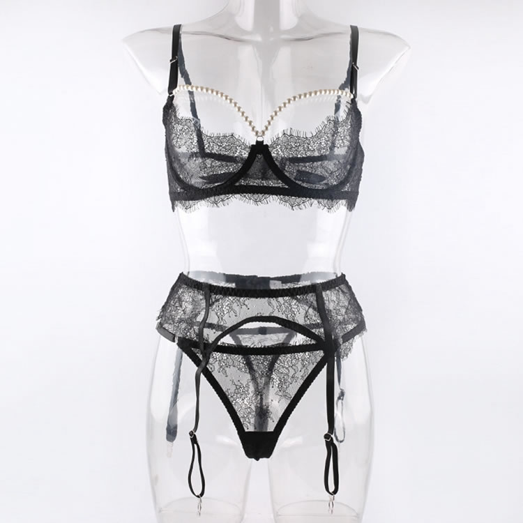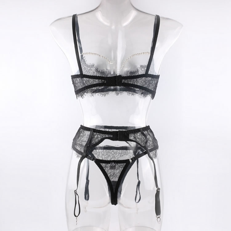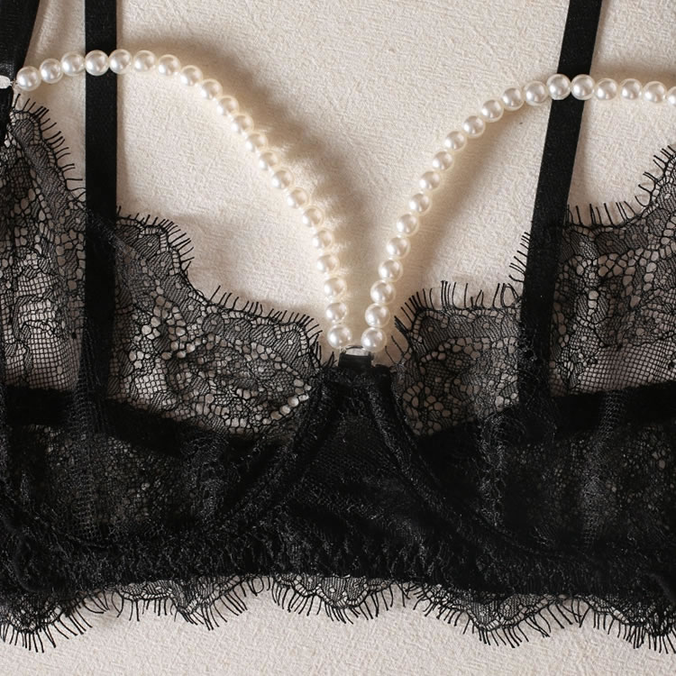 Expose all your sensuality in this eyelash lace bra set featuring sheer lace underwire cups with pearl strand detailing, adjustable strapped spaghetti straps, a hook and eye back closure, a matching garter belt with adjustable garter straps, and a matching panty.