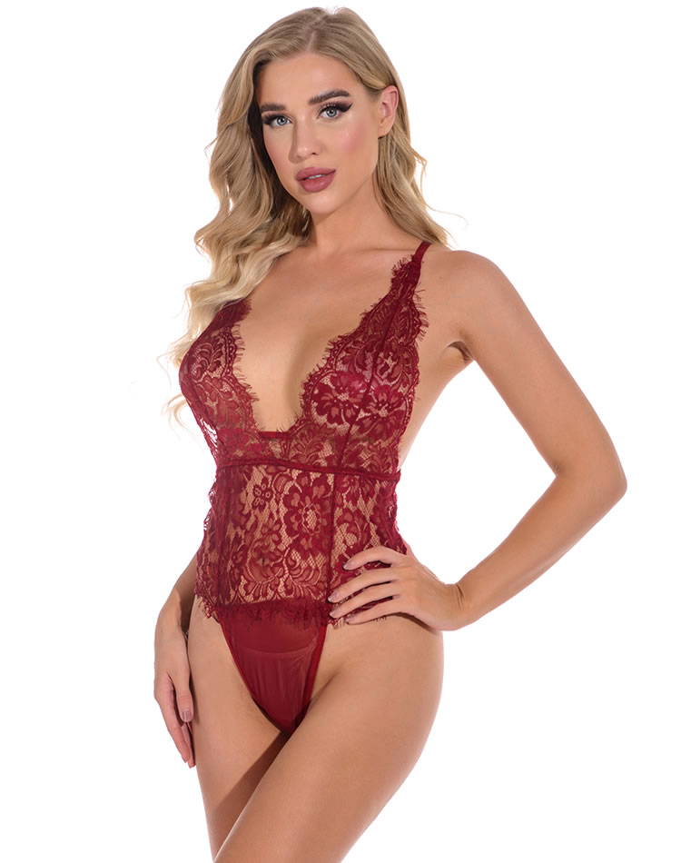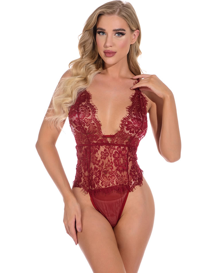 Work all your sexy curves in this seductive lace teddy a plunging V-neckline with sheer eyelash lace trim, adjustable spaghetti straps, a hook back closures, a sheer mesh crotch panel, and a thong cut back.