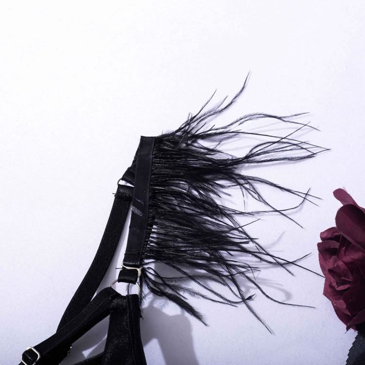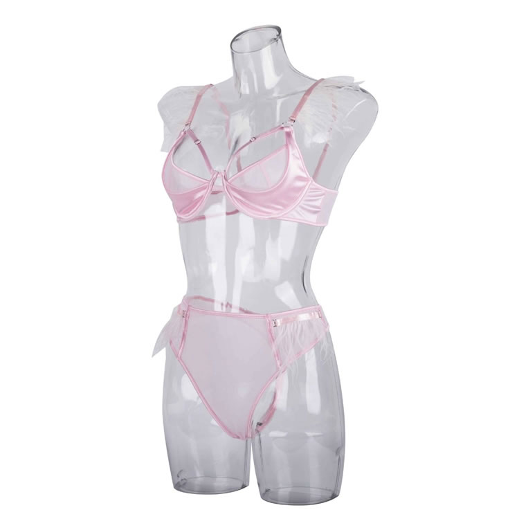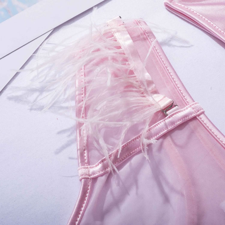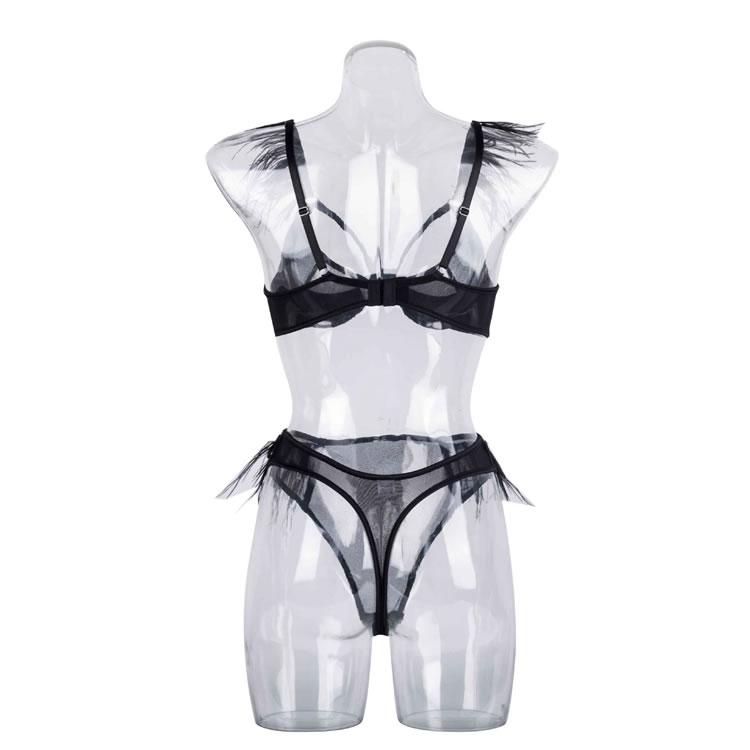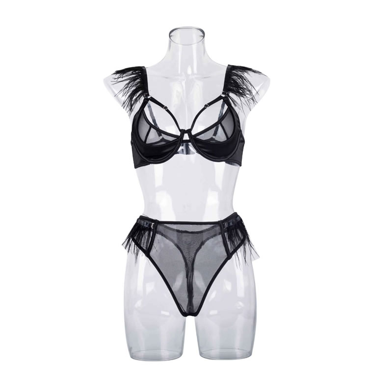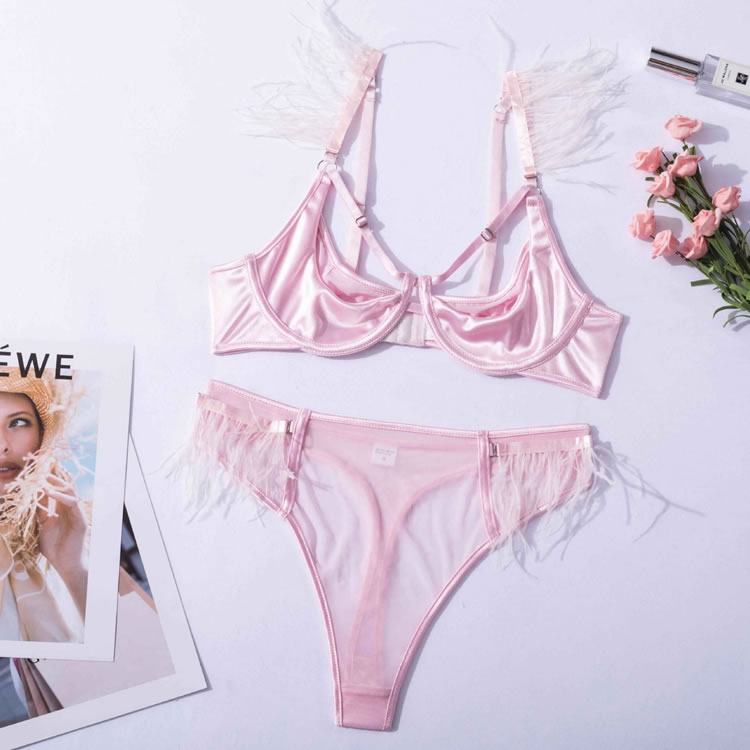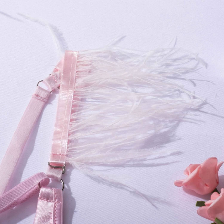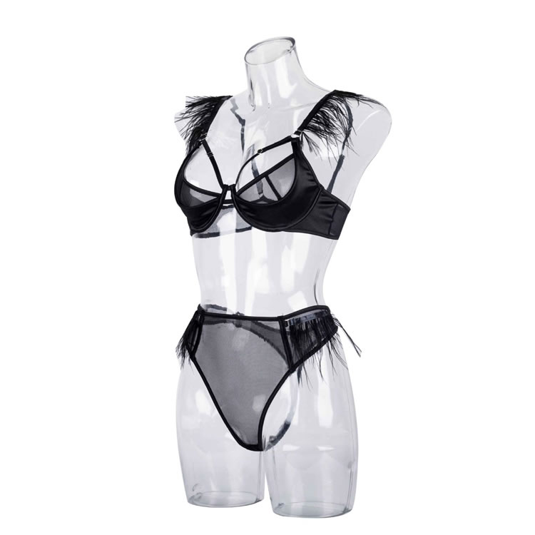 Set your sights high in this exclusive bra set featuring soft underwire cups with strappy bust detailing, adjustable spaghetti straps with feather trim, a hook and eye back closure, and a matching high leg panty with a cheeky cut back. (Robe not included.)