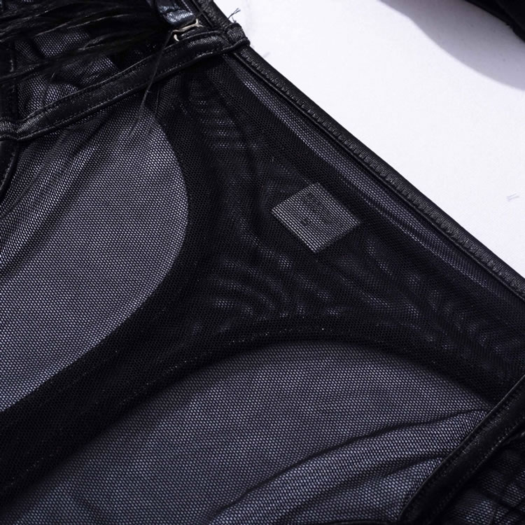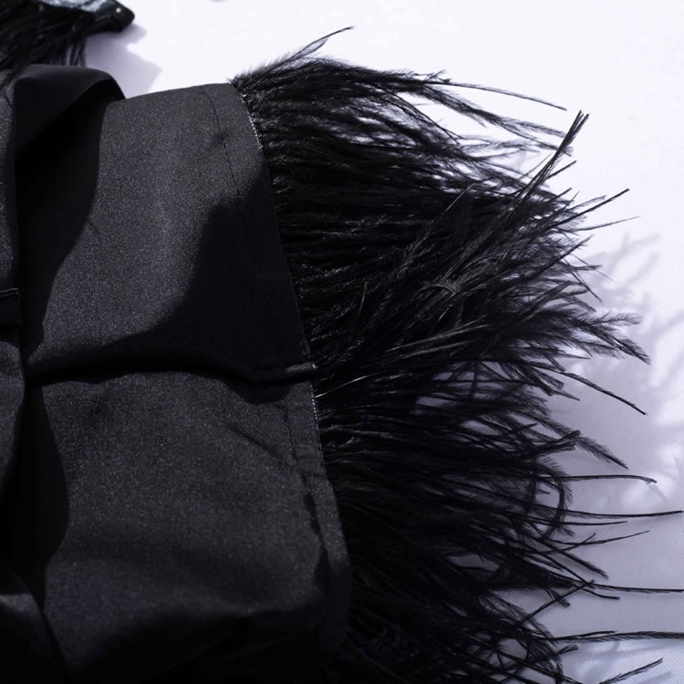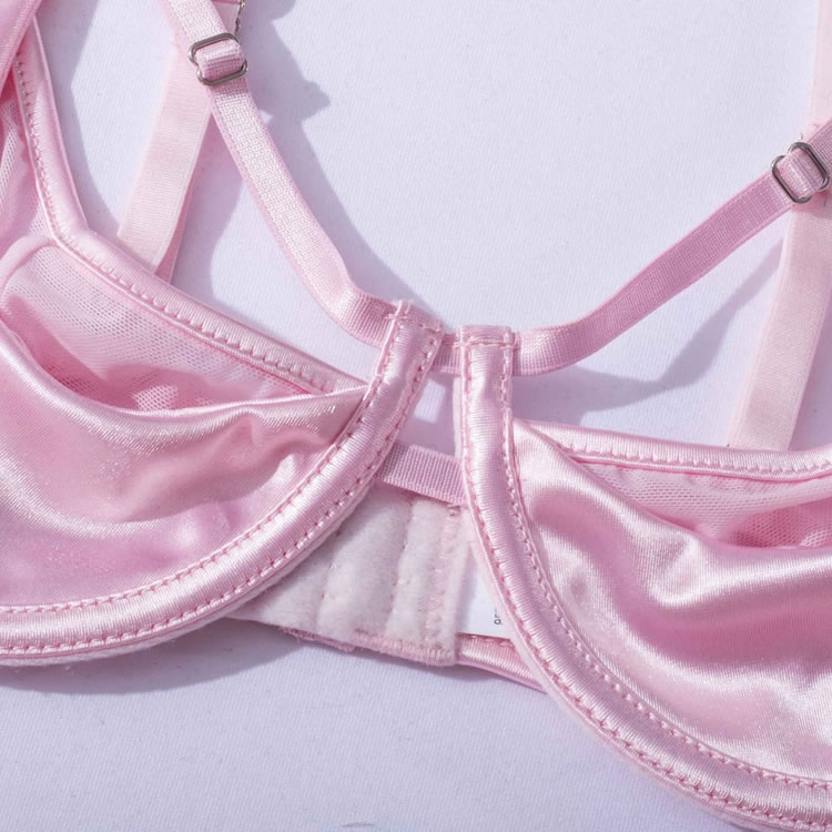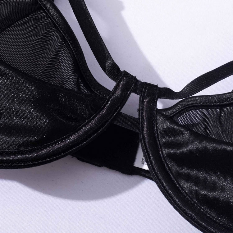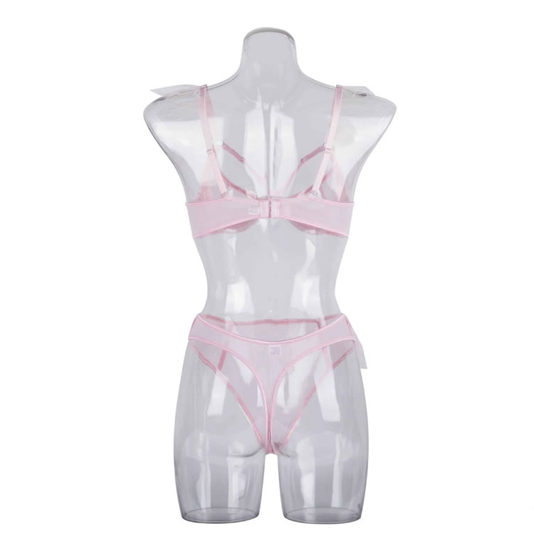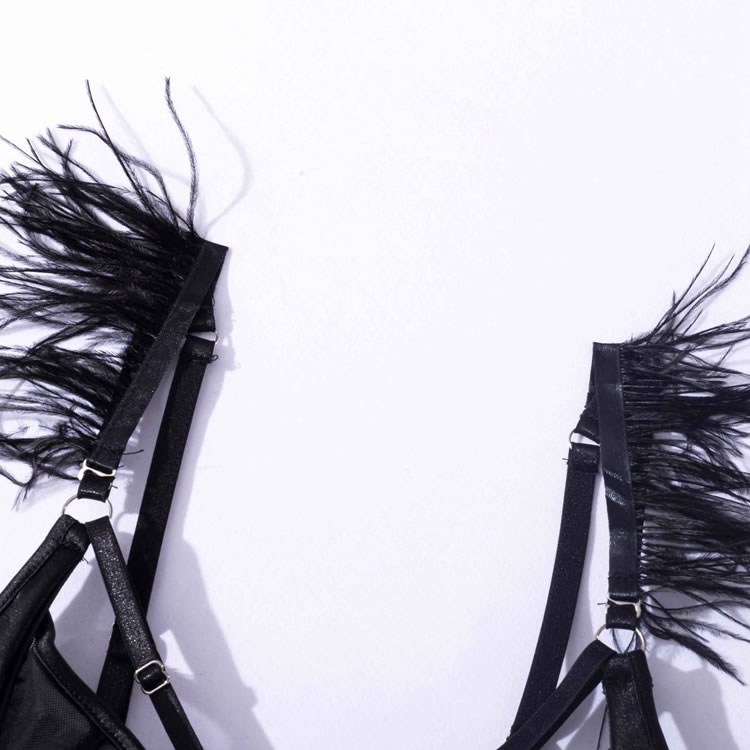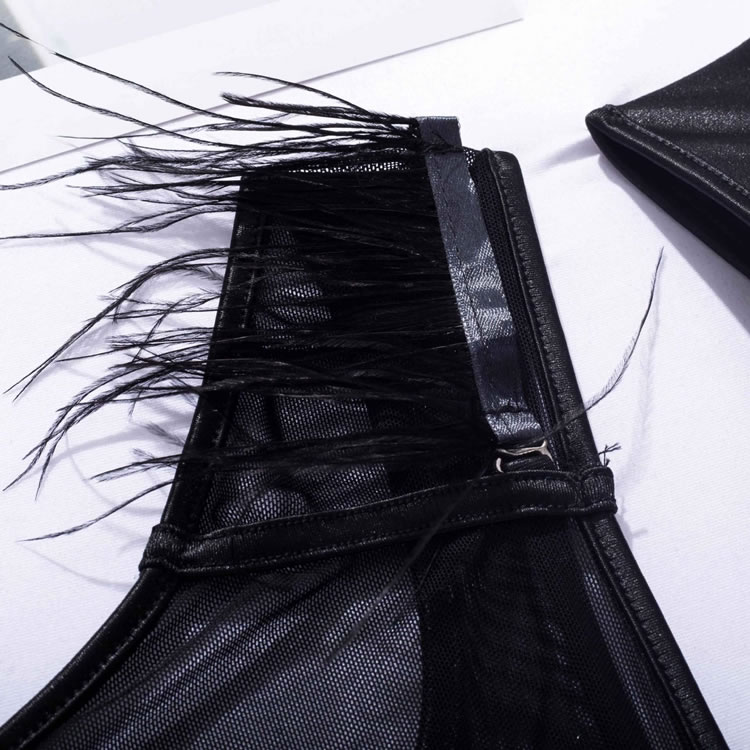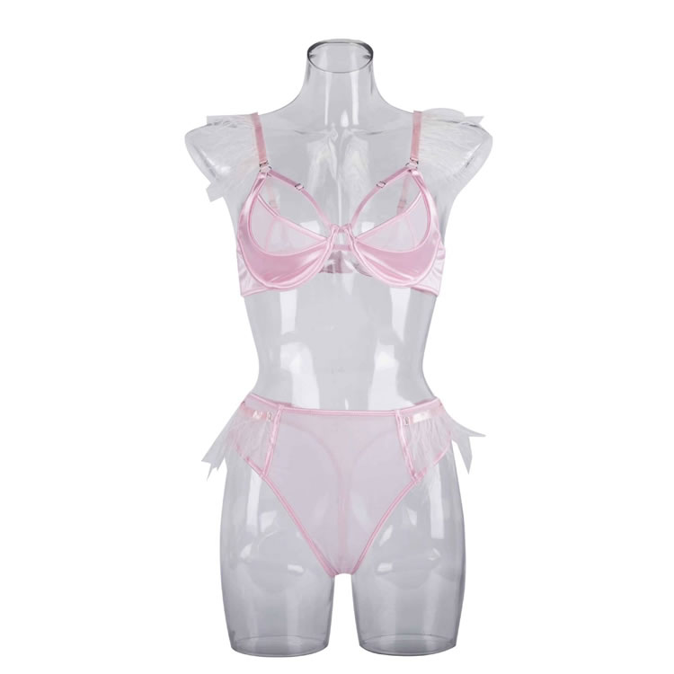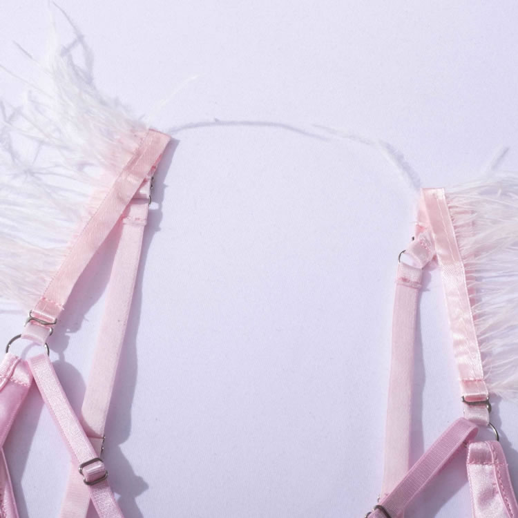 Set your sights high in this exclusive bra set featuring soft underwire cups with strappy bust detailing, adjustable spaghetti straps with feather trim, a hook and eye back closure, and a matching high leg panty with a cheeky cut back. (Robe not included.)