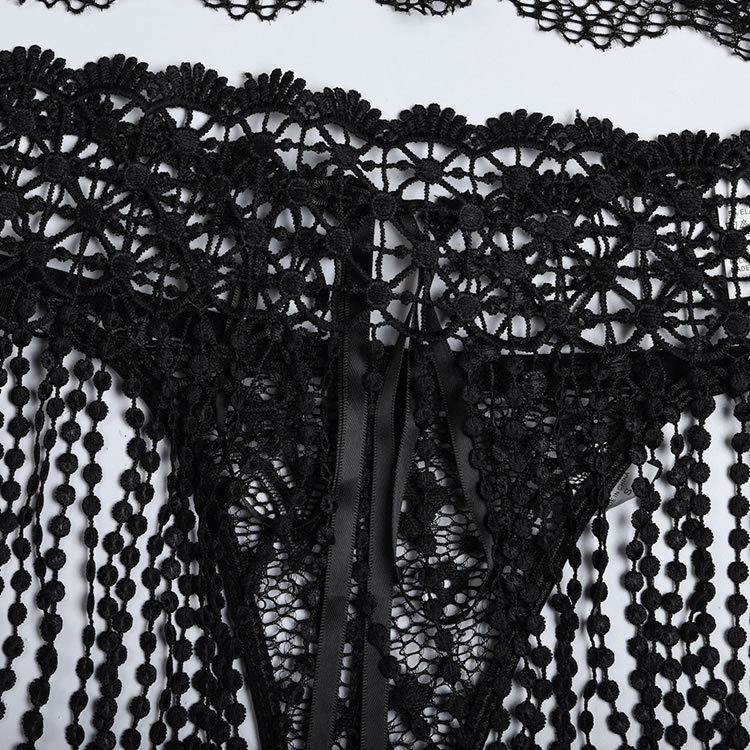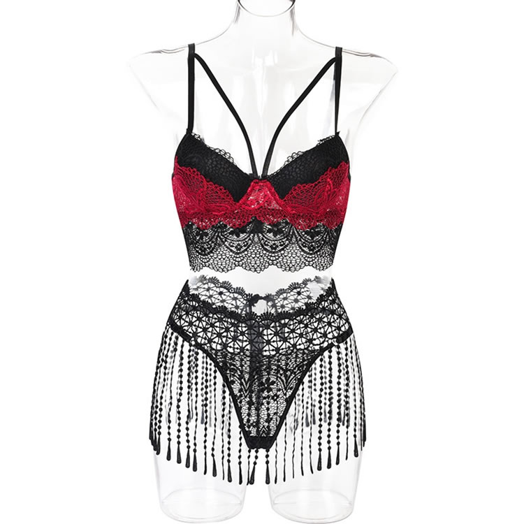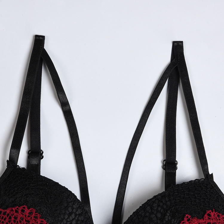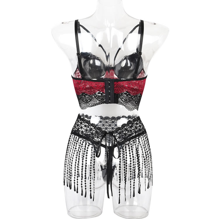 Add a touch of style to your sexy look with this trendy skirt set featuring a bra top with underwire cups, strappy bust detailing, a lace longline underbust, a hook and eye back closure, a matching mini skirt with a tie back closure, and a matching panty. (Lace Arm Bands Included)