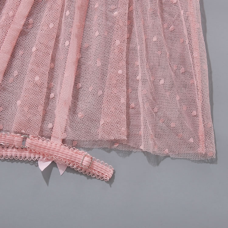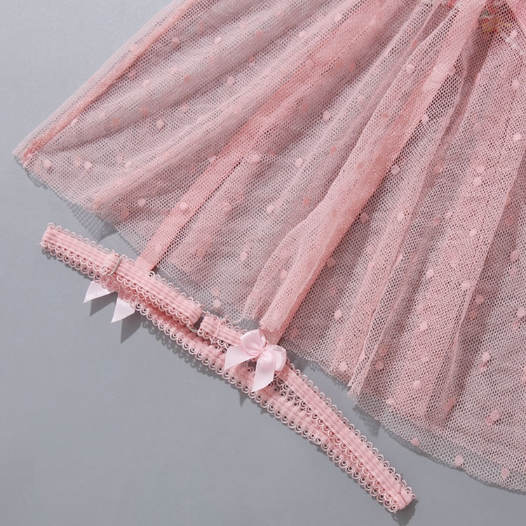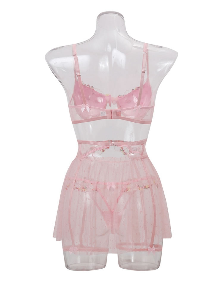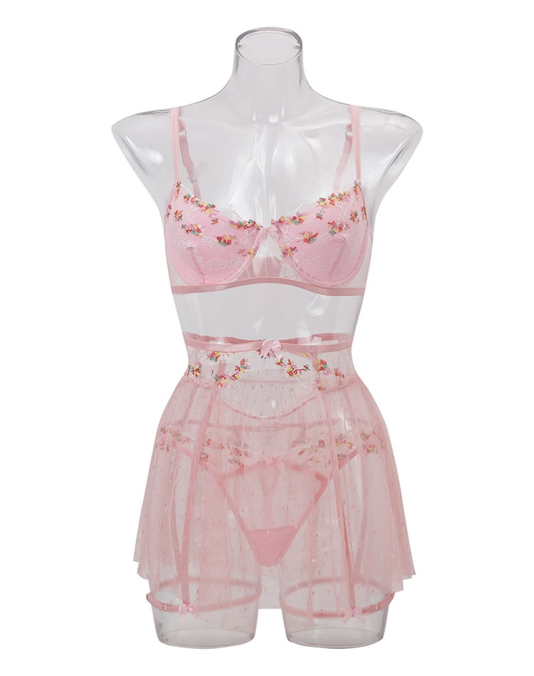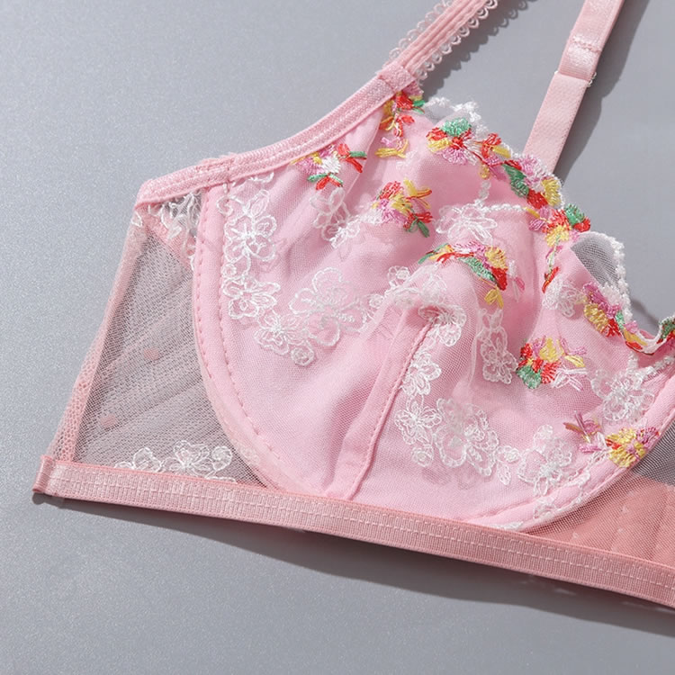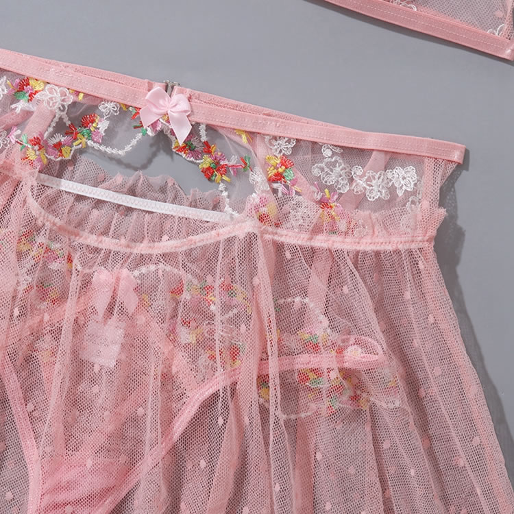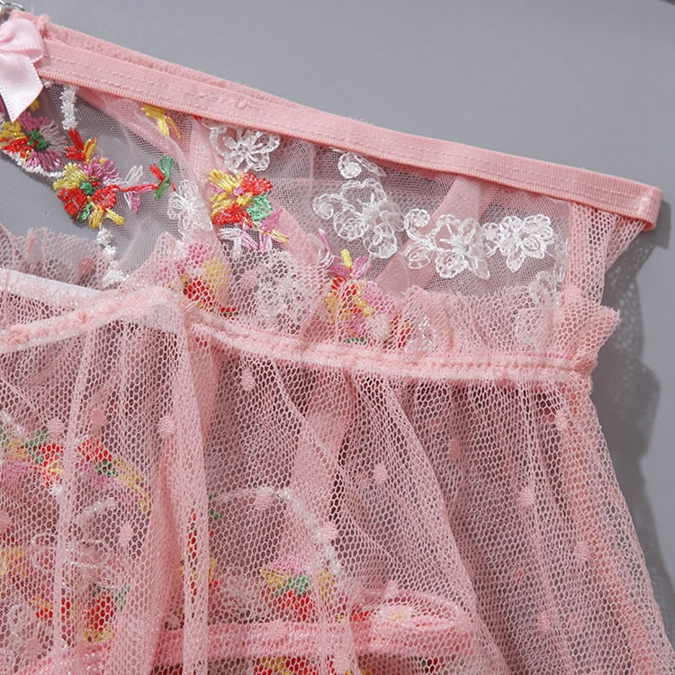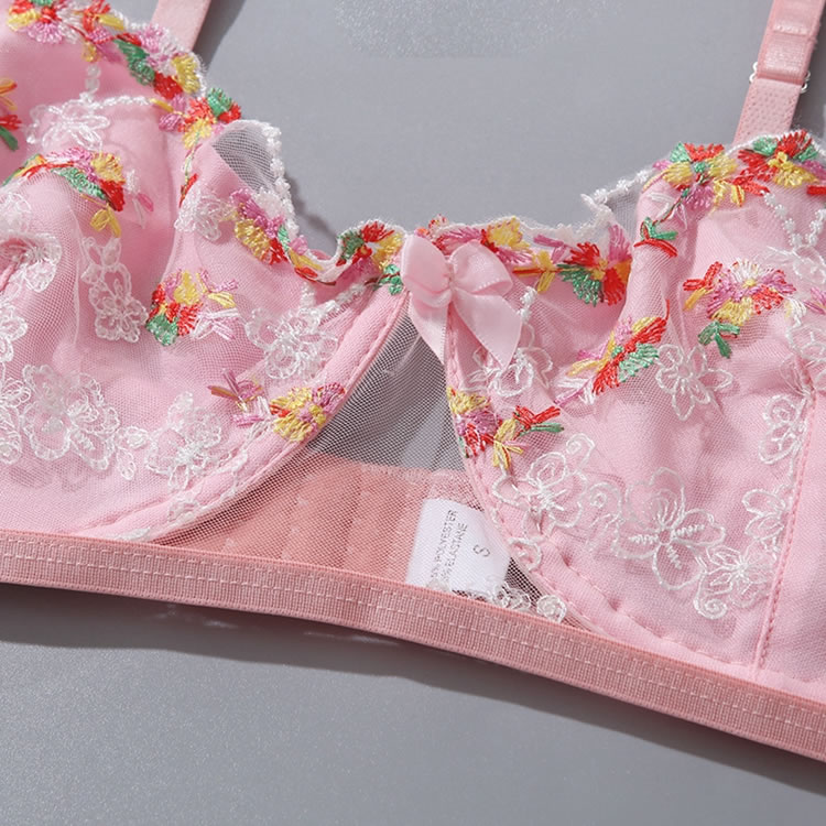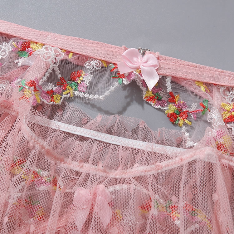 Brighten up your boudoir in this flirty lingerie set featuring an underwire bra, a colorful, embroidered trim, adjustable spaghetti straps, a hook and eye back closure, a matching garter belt with adjustable garter straps, a matching panty.