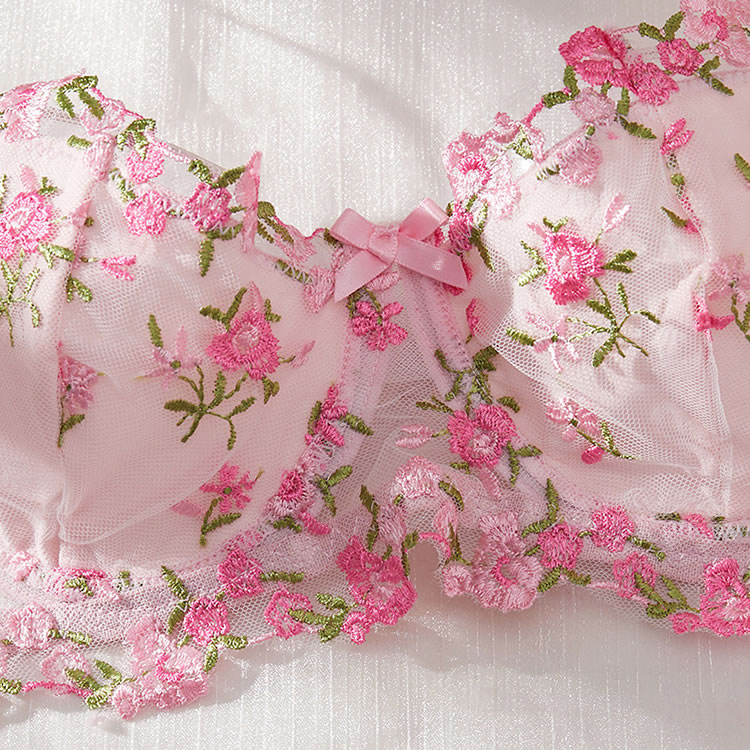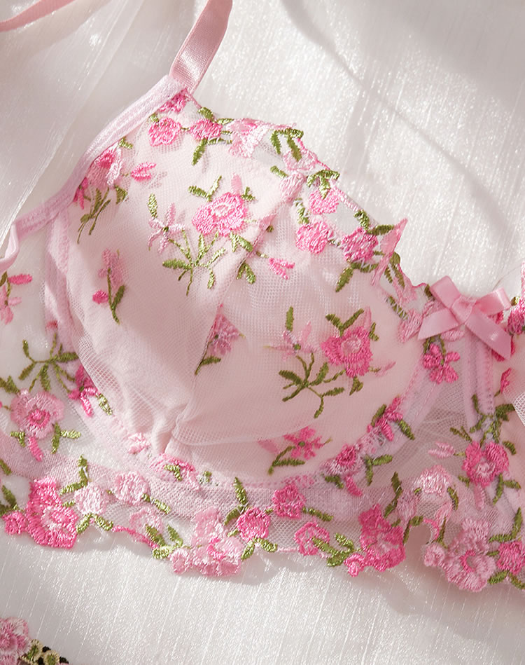 Floral Embroidered, Underwire, G-String, Garter Belt, 4 Pieces Lingerie