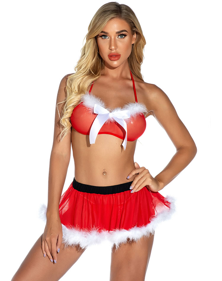Should you be on the nice or naughty list this year? Spread some holiday cheer in this Ho Ho Hottie lingerie costume featuring sheer mesh cups with a marabou trim, halter straps, a hook and eye back closure, a matching skirt with a white marabou hem.